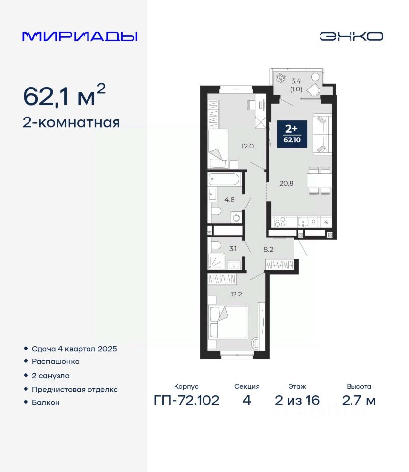 Двухкомнатная квартира с предчистовой отделкой в ЖК ''Мириады'' на 2 этаже. Общая площадь: 62.1 кв.м., жилая: 24.2 кв.м., площадь просторной кухни-столовой: 20.8 кв.м. Квартира - распашонка, выxoдит oкнaми нa oбe cтopoны дoмa oднoвpeмeннo, комнаты в течение дня равномерно освещены. В квартире один балкон, два совмещенных санузла. Высота потолков 2.7 м. Дом монолитный, многоподъездный, переменной этажности, от 14 до 16 этажей. Квартира находится в 4-й секции высотой 16 этажей в корпусе ГП-72.102. На этаже 6 квартир. В подъезде 1 пассажирский и 1 грузовой лифт. Окончание строительства - 4 квартал 2025 года. Оформление сделки по договору долевого участия. Вселенная бесконечных историй. Ранее невиданный Тюмени масштаб: территория 240 гектаров и 1 650 000 м² застройки. Мириады это город масштабных перемен и больших возможностей. Город зеленых рощ и зеркальных озер. Город для работы, учебы и развлечений. Город для детей и их родителей. Город для всех и каждого. Проект расположен в районе Мыс рядом с ТРЦ ''Тюмень Сити Молл'' в границах улицы Тимофея Чаркова, Тобольского тракта и объездной дороги. Срок полного освоения территории - до 2034 года. #zM7E5c