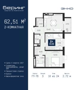 Продается двухкомнатная квартира от застройщика с предчистовой отделкой в ЖК ''Беринг'' на 21 этаже. Общая площадь: 72.82 кв.м., жилая: 31.81 кв.м., площадь просторной кухни-столовой: 20.62 кв.м. Квартира - распашонка, без проходных комнат, окна выходят на paзные стороны дома. В квартире один балкон, один совмещенный и один раздельный санузел. Высота потолков 2.75 м. Дом монолитный, многоподъездный, переменной этажности, от 9 до 22 этажей. Квартира находится в 73.5-й секции высотой 21 этаж в корпусе ГП-73. На этаже 6 квартир. В подъезде 1 пассажирский и 1 грузовой лифт. Окончание строительства - 1 квартал 2026 года. Оформление сделки по договору долевого участия. Подобно знаменитому исследователю, мы чувствуем себя первооткрывателями этой локации. Хотим показать новую суть места, сформировать для вас жизненный опыт, которого ещё не было. Беринг — район зелёного цвета. Беринг — район, который откроется вам с другой стороны. Впечатлит новым уровнем комфорта и качеством жизни. Беринг — открытие на карте города. Первый квартал расположен в районе Тура, в границах улиц: Камчатская Западносибирская Энтузиастов. Вокруг уже есть всё для того, чтобы ежедневная рутина была лишь частью жизни и не доставляла дискомфорта.Школы и детские сады, магазины и аптеки, поликлиника, места для семейного отдыха, пеших и велопрогулок, и даже рыбалки. Масштабное озеленение дворов — визитная карточка ЭНКО и ваш оазис спокойствия, чтобы отвлечься от повседневности. Раскидистые деревья, кустарники, травы и цветы — осталось остановиться, вдохнуть и расслабиться, глядя на эту природную красоту. Стилистика подъездов продолжает концепцию Беринга, вдохновлённого Камчаткой: сдержанный,но при этом впечатляющий дизайн соседствует с удобством и функциональностью. #2us7cB