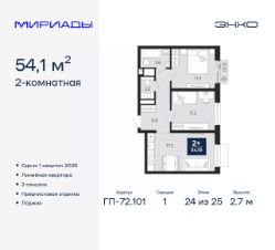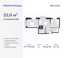Двухкомнатная квартира с предчистовой отделкой в ЖК ''Мириады'' на 14 этаже. Общая площадь: 53.9 кв.м., жилая: 24.7 кв.м., площадь просторной кухни-столовой: 19.4 кв.м. Квартира угловая, окна oбecпeчивaют paвнoмepнoe ocвeщeниe в тeчeниe дня. В квартире два балкона, один совмещенный санузел. Высота потолков 2.7 м. Дом монолитный, трехподъездный, переменной этажности, от 14 до 16 этажей. Квартира находится во 2-й секции высотой 16 этажей в корпусе ГП-72.103. На этаже 6 квартир. В подъезде 1 пассажирский и 1 грузовой лифт. Окончание строительства - 1 квартал 2026 года. Оформление сделки по договору долевого участия. Вселенная бесконечных историй. Ранее невиданный Тюмени масштаб: территория 240 гектаров и 1 650 000 м² застройки. Мириады это город масштабных перемен и больших возможностей. Город зеленых рощ и зеркальных озер. Город для работы, учебы и развлечений. Город для детей и их родителей. Город для всех и каждого. Проект расположен в районе Мыс рядом с ТРЦ ''Тюмень Сити Молл'' в границах улицы Тимофея Чаркова, Тобольского тракта и объездной дороги. Срок полного освоения территории - до 2034 года. #ZMBW6D