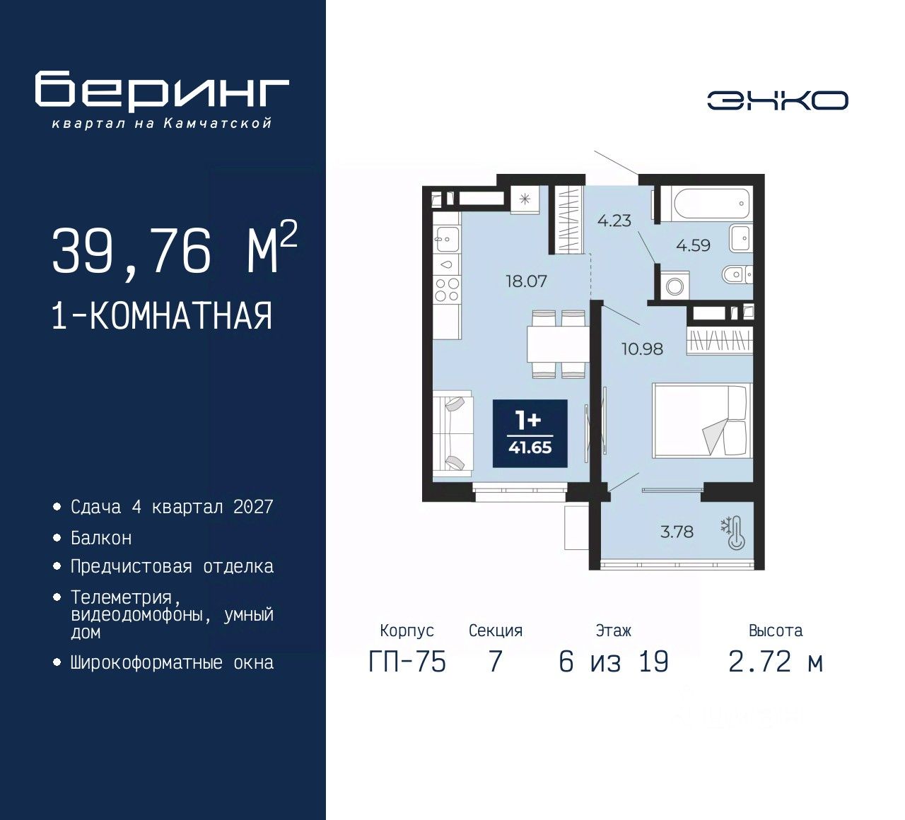 Просторная 1-комн. квартира с предчистовой отделкой в ЖК ''Беринг'' на 6 этаже. Общая площадь: 39.76 кв.м., жилая: 10.98 кв.м., площадь просторной кухни-столовой: 18.07 кв.м. Все окна выходят на одну сторону. В квартире один балкон, один совмещенный санузел. Высота потолков 2.72 м. Дом монолитный, многоподъездный, переменной этажности, от 17 до 24 этажей. Квартира находится в 7-й секции высотой 19 этажей в корпусе ГП-75. На этаже 7 квартир. В подъезде 2 пассажирских и 1 грузовой лифт. Окончание строительства - 4 квартал 2027 года. Оформление сделки по договору долевого участия. Подобно знаменитому исследователю, мы чувствуем себя первооткрывателями этой локации. Хотим показать новую суть места, сформировать для вас жизненный опыт, которого ещё не было. Беринг — район зелёного цвета. Беринг — район, который откроется вам с другой стороны. Впечатлит новым уровнем комфорта и качеством жизни. Беринг — открытие на карте города. Первый квартал расположен в районе Тура, в границах улиц: Камчатская Западносибирская Энтузиастов. Вокруг уже есть всё для того, чтобы ежедневная рутина была лишь частью жизни и не доставляла дискомфорта. Школы и детские сады, магазины и аптеки, поликлиника, места для семейного отдыха, пеших и велопрогулок, и даже рыбалки. Масштабное озеленение дворов — визитная карточка ЭНКО и ваш оазис спокойствия, чтобы отвлечься от повседневности. Раскидистые деревья, кустарники, травы и цветы — осталось остановиться, вдохнуть и расслабиться, глядя на эту природную красоту. Стилистика подъездов продолжает концепцию Беринга, вдохновлённого Камчаткой: сдержанный, но при этом впечатляющий дизайн соседствует с удобством и функциональностью. #ZmggUw