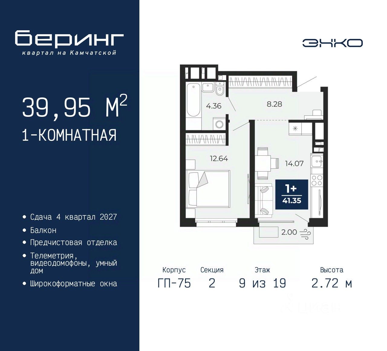 Просторная однокомнатная квартира с предчистовой отделкой в ЖК ''Беринг'' на 9 этаже. Общая площадь: 39.95 кв.м., жилая: 12.64 кв.м., площадь просторной кухни-столовой: 14.07 кв.м. Все окна выходят на одну сторону. В квартире один балкон, один совмещенный санузел. Высота потолков 2.72 м. Дом монолитный, многоподъездный, переменной этажности, от 17 до 24 этажей. Квартира находится во 2-й секции высотой 19 этажей в корпусе ГП-75. На этаже 7 квартир. В подъезде 2 пассажирских и 1 грузовой лифт. Окончание строительства - 4 квартал 2027 года. Оформление сделки по договору долевого участия. Подобно знаменитому исследователю, мы чувствуем себя первооткрывателями этой локации. Хотим показать новую суть места, сформировать для вас жизненный опыт, которого ещё не было. Беринг — район зелёного цвета. Беринг — район, который откроется вам с другой стороны. Впечатлит новым уровнем комфорта и качеством жизни. Беринг — открытие на карте города. Первый квартал расположен в районе Тура, в границах улиц: Камчатская Западносибирская Энтузиастов. Вокруг уже есть всё для того, чтобы ежедневная рутина была лишь частью жизни и не доставляла дискомфорта. Школы и детские сады, магазины и аптеки, поликлиника, места для семейного отдыха, пеших и велопрогулок, и даже рыбалки. Масштабное озеленение дворов — визитная карточка ЭНКО и ваш оазис спокойствия, чтобы отвлечься от повседневности. Раскидистые деревья, кустарники, травы и цветы — осталось остановиться, вдохнуть и расслабиться, глядя на эту природную красоту. Стилистика подъездов продолжает концепцию Беринга, вдохновлённого Камчаткой: сдержанный, но при этом впечатляющий дизайн соседствует с удобством и функциональностью. #Z6ggwl