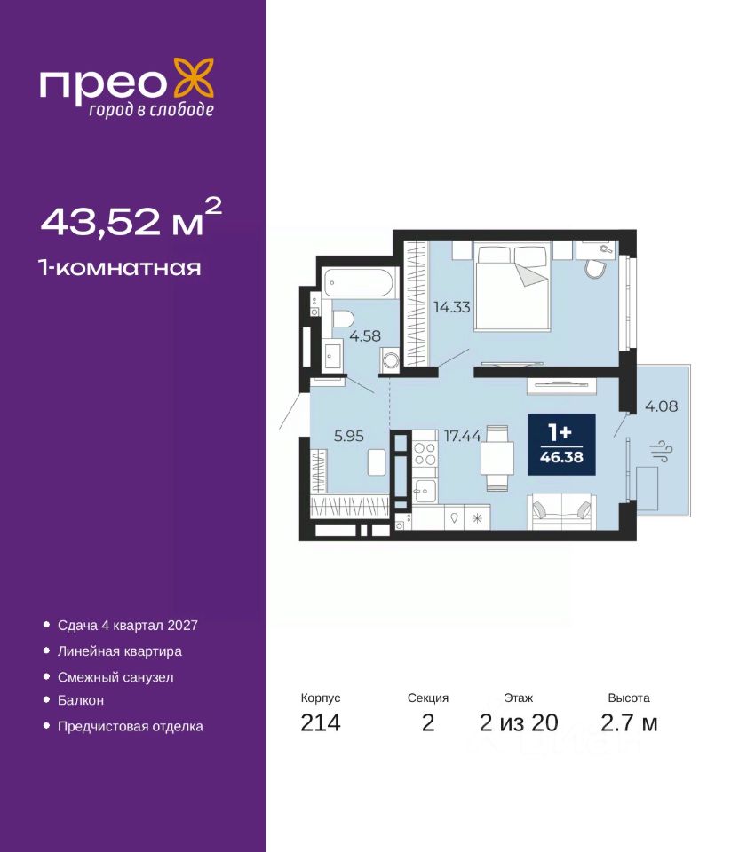 Однокомнатная квартира с предчистовой отделкой в ЖК ''Прео'' на 2 этаже. Общая площадь: 43.52 кв.м., жилая: 14.33 кв.м., площадь просторной кухни-столовой: 17.44 кв.м. Все окна выходят на одну сторону. В квартире один балкон, один совмещенный санузел. Высота потолков 2.7 м. Дом монолитный, двухподъездный, переменной этажности, от 12 до 20 этажей. Квартира находится во 2-й секции высотой 20 этажей в корпусе 214. На этаже 8 квартир. В подъезде 1 пассажирский и 1 грузовой лифт. Окончание строительства - 4 квартал 2027 года. Оформление сделки по договору долевого участия. Преображенский — один из самых привлекательных районов для жизни! Это полностью самостоятельный жилой район с точки зрения инфраструктуры. Преображенский находится между Московским и Червишевским трактами в квартале улиц Закалужская — Вьюжная — Александра Протозанова. Не нужно ждать, когда появится инфраструктура — переезжайте на всё готовое. Вблизи расположены действующие школа и детский сад. В этом году откроется еще один сад, а в следующем году — школа. По соседству с Преображенским запланировано строительство городского парка ''Комарово'' площадью 38 гектар. За 10 минут можно доехать на автомобиле до крупных ТРЦ: ''Лента'', ''Кристалл'', ''Леруа Мерлен'', ''Метро'' и ''Ашан''. С 2018 года в районе открыт Соседский центр — пространство, созданное для формирования добрососедской среды, совместного досуга, общения и реализации соседских инициатив. Здесь проходят встречи соседей, а также сами жители района организовывают мероприятия. Организатором такого события может стать любой желающий. В квартирах выполнена качественная предчистовая отделка. Гладкие стены с финишным выравниванием по маякам. Ровный потолок для установки натяжного потолка. Установлены пятикамерные окна с двойным стеклопакетом (3 стекла). Дизайнерские холлы с видеонаблюдением, безбарьерным и прозрачным входом всегда светло и спокойно. На первом этаже есть просторные колясочные, где все жители могут оставлять свои коляски и велосипеды. В Преображенском есть всё, что нужно для активного отдыха и занятий спортом. Мы сделали большое футбольное поле с безопасным покрытием. Также установили хоккейный корт, который оборудован по всем необходимым стандартам. Во дворах можно делать упражнения на специальных площадках с турниками. Весь район мы обустроили велодорожками, которые связаны в единый маршрут. У нас есть сухие фонтаны, бьющие из земли, деревья, веревки, сетки, скалодром, газон, песок и резинка — осталось просто дать своему ребенку право на свободную игру. По-настоящему хорошие дворы — это те, которые дети предпочитают соцсетям и телевизору. Аккредитация в банках: ПАО Банк ''ВТБ'', ОАО ''Альфа-Банк'', ПАО ''Банк Уралсиб'', ''Сбербанк России'', ПАО ''Газпромбанк'' и других. #zm8gUu