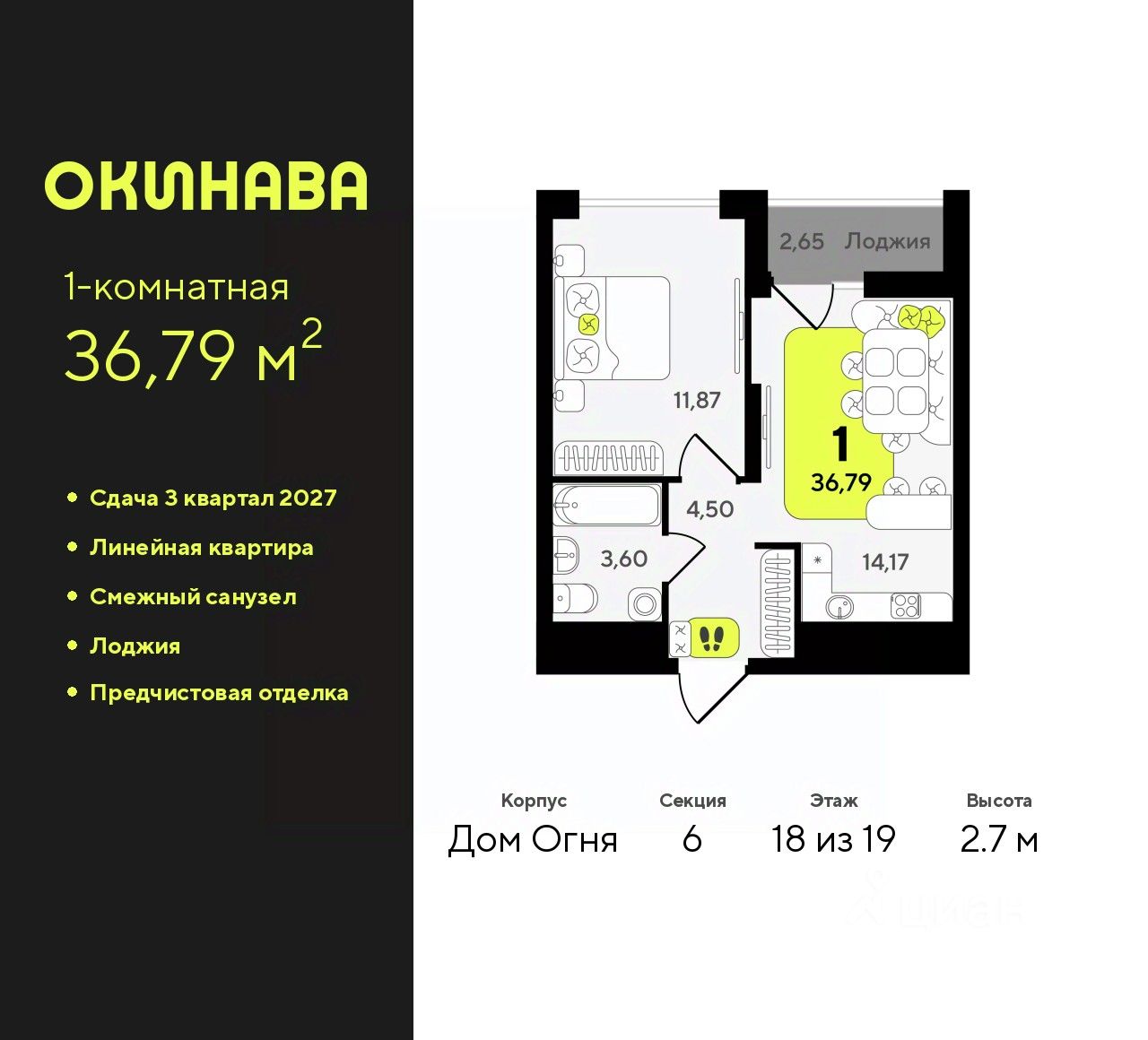 Однокомнатная квартира от застройщика с предчистовой отделкой в ЖК ''Окинава'' на 18 этаже. Общая площадь: 36.79 кв.м., жилая: 11.87 кв.м., площадь просторной кухни-столовой: 14.17 кв.м. Все окна выходят на одну сторону. В квартире одна лоджия, один совмещенный санузел. Высота потолков 2.7 м. Квартира будет сдана с предчистовой отделкой: на полах стяжка под финишное покрытие, стены подготовлены под покраску или оклейку обоями, разведена вся электрика с подготовкой для установки выключателей и освещения. При желании вы можете заказать отделку под ключ, варианты возможных решений представлены в альбоме фотографий. Дом монолитный, многоподъездный, переменной этажности, от 13 до 19 этажей. Квартира находится в 6-й секции высотой 19 этажей в корпусе Дом Огня. На этаже 12 квартир. В подъезде 2 пассажирских и 1 грузовой лифт. Окончание строительства - 3 квартал 2027 года. Оформление сделки по договору долевого участия. ЖК ''Окинава'' это не просто жилой комплекс, это остров 4 стихий. Они отражаются во внешнем виде фасадов домов, обустройстве дворов и внутреннем оформлении холлов. Каждая из стихий это отдельный дом. Между домами раскинется большой двухуровневый пешеходный бульвар. Первый уровень прогулочный с местами для отдыха, амфитеатром и фонтанами. На втором уровне расположатся площадки для детей, спортивных игр и тренировок. Квартал будет располагать богатой инфраструктурой: на первых этажах разместятся магазины, пекарни, кофейни, пункты выдачи, аптеки, детские центры, цветочные салоны и многое другое, что сделает жизнь поистине комфортной. В жилом комплексе есть кладовые, а также несколько видов паркинга: уличный гостевой, закрытый теплый и паркинг в стилобате, попасть в который можно на лифте с любого жилого этажа. Дворы в каждом доме отражают его стихию, отличаясь по наполнению. Они дополняют друг друга, образуя единое дворовое пространство жилого комплекса. Закрытая территория, свободная от автомобилей, обеспечит безопасность и спокойный отдых. Холлы оформлены керамогранитом, зеркалами и разноуровневым освещением. Витражные входные группы, мягкие зоны ожидания, видеонаблюдение 24/7, вместительные колясочные и даже лапомойки для питомцев всё это будет в ЖК ''Окинава''. Жилой комплекс ''Окинава'' находится в активно развивающемся V заречном микрорайоне, недалеко от озера Алебашево, где в будущем расположится масштабный ивент-парк с зонами отдыха. Удобная транспортная развязка позволит добраться до центра всего за 15 минут. #24eZo2