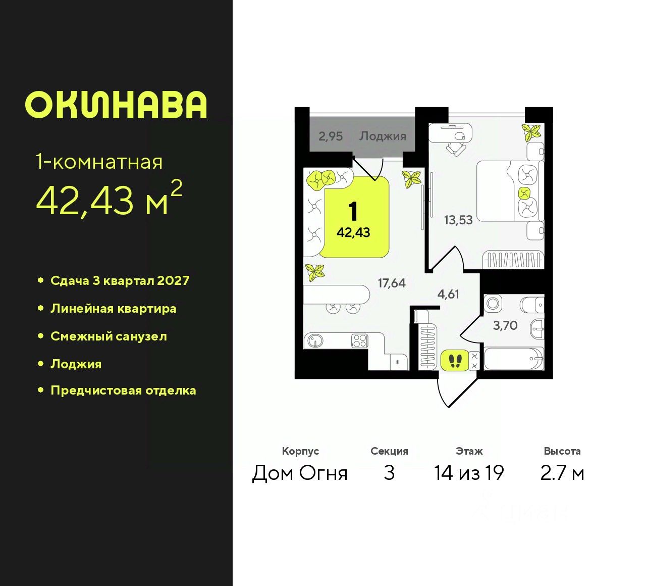 Просторная однокомнатная квартира с предчистовой отделкой в ЖК ''Окинава'' на 15 этаже. Общая площадь: 42.43 кв.м., жилая: 13.53 кв.м., площадь просторной кухни-столовой: 17.64 кв.м. Все окна выходят на одну сторону. В квартире одна лоджия, один совмещенный санузел. Высота потолков 2.7 м. Квартира будет сдана с предчистовой отделкой: на полах стяжка под финишное покрытие, стены подготовлены под покраску или оклейку обоями, разведена вся электрика с подготовкой для установки выключателей и освещения. При желании вы можете заказать отделку под ключ, варианты возможных решений представлены в альбоме фотографий. Дом монолитный, многоподъездный, переменной этажности, от 13 до 19 этажей. Квартира находится в 3-й секции высотой 19 этажей в корпусе Дом Огня. На этаже 11 квартир. В подъезде 1 пассажирский и 1 грузовой лифт. Окончание строительства - 3 квартал 2027 года. Оформление сделки по договору долевого участия. ЖК ''Окинава'' это не просто жилой комплекс, это остров 4 стихий. Они отражаются во внешнем виде фасадов домов, обустройстве дворов и внутреннем оформлении холлов. Каждая из стихий это отдельный дом. Между домами раскинется большой двухуровневый пешеходный бульвар. Первый уровень прогулочный с местами для отдыха, амфитеатром и фонтанами. На втором уровне расположатся площадки для детей, спортивных игр и тренировок. Квартал будет располагать богатой инфраструктурой: на первых этажах разместятся магазины, пекарни, кофейни, пункты выдачи, аптеки, детские центры, цветочные салоны и многое другое, что сделает жизнь поистине комфортной. В жилом комплексе есть кладовые, а также несколько видов паркинга: уличный гостевой, закрытый теплый и паркинг в стилобате, попасть в который можно на лифте с любого жилого этажа. Дворы в каждом доме отражают его стихию, отличаясь по наполнению. Они дополняют друг друга, образуя единое дворовое пространство жилого комплекса. Закрытая территория, свободная от автомобилей, обеспечит безопасность и спокойный отдых. Холлы оформлены керамогранитом, зеркалами и разноуровневым освещением. Витражные входные группы, мягкие зоны ожидания, видеонаблюдение 24/7, вместительные колясочные и даже лапомойки для питомцев всё это будет в ЖК ''Окинава''. Жилой комплекс ''Окинава'' находится в активно развивающемся V заречном микрорайоне, недалеко от озера Алебашево, где в будущем расположится масштабный ивент-парк с зонами отдыха. Удобная транспортная развязка позволит добраться до центра всего за 15 минут. #24E2ib