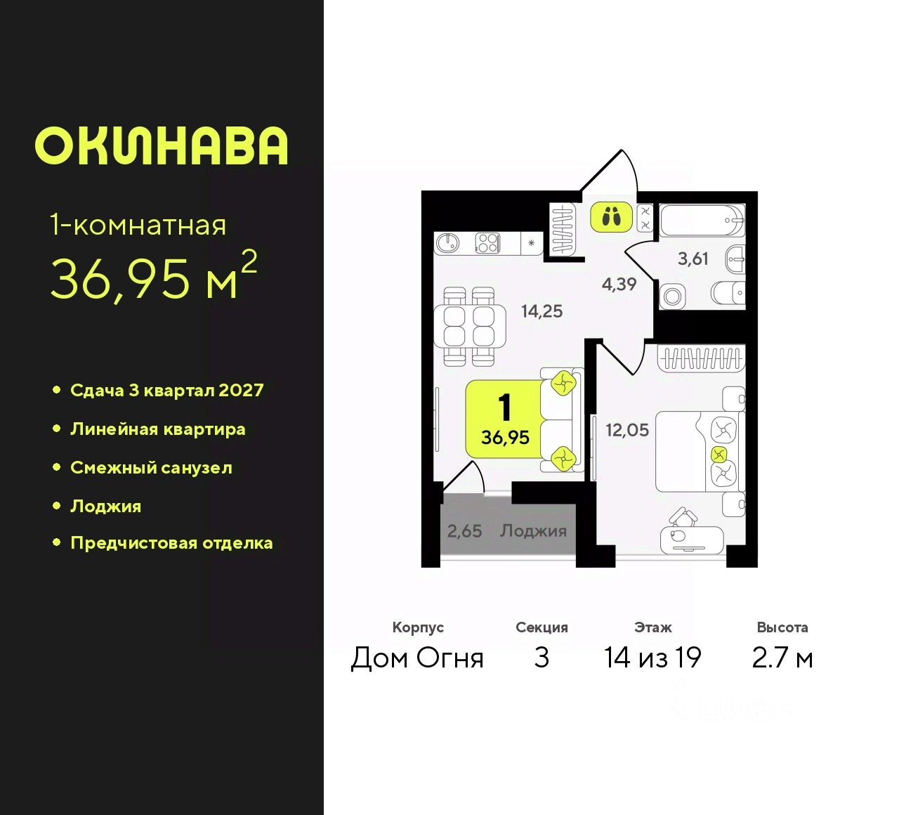 Продается 1-комн. квартира с предчистовой отделкой в ЖК ''Окинава'' на 9 этаже. Общая площадь: 36.95 кв.м., жилая: 12.05 кв.м., площадь просторной кухни-столовой: 14.25 кв.м. Все окна выходят на одну сторону. В квартире одна лоджия, один совмещенный санузел. Высота потолков 2.7 м. Квартира будет сдана с предчистовой отделкой: на полах стяжка под финишное покрытие, стены подготовлены под покраску или оклейку обоями, разведена вся электрика с подготовкой для установки выключателей и освещения. При желании вы можете заказать отделку под ключ, варианты возможных решений представлены в альбоме фотографий. Дом монолитный, многоподъездный, переменной этажности, от 13 до 19 этажей. Квартира находится в 3-й секции высотой 19 этажей в корпусе Дом Огня. На этаже 11 квартир. В подъезде 1 пассажирский и 1 грузовой лифт. Окончание строительства - 3 квартал 2027 года. Оформление сделки по договору долевого участия. ЖК ''Окинава'' это не просто жилой комплекс, это остров 4 стихий. Они отражаются во внешнем виде фасадов домов, обустройстве дворов и внутреннем оформлении холлов. Каждая из стихий это отдельный дом. Между домами раскинется большой двухуровневый пешеходный бульвар. Первый уровень прогулочный с местами для отдыха, амфитеатром и фонтанами. На втором уровне расположатся площадки для детей, спортивных игр и тренировок. Квартал будет располагать богатой инфраструктурой: на первых этажах разместятся магазины, пекарни, кофейни, пункты выдачи, аптеки, детские центры, цветочные салоны и многое другое, что сделает жизнь поистине комфортной. В жилом комплексе есть кладовые, а также несколько видов паркинга: уличный гостевой, закрытый теплый и паркинг в стилобате, попасть в который можно на лифте с любого жилого этажа. Дворы в каждом доме отражают его стихию, отличаясь по наполнению. Они дополняют друг друга, образуя единое дворовое пространство жилого комплекса. Закрытая территория, свободная от автомобилей, обеспечит безопасность и спокойный отдых. Холлы оформлены керамогранитом, зеркалами и разноуровневым освещением. Витражные входные группы, мягкие зоны ожидания, видеонаблюдение 24/7, вместительные колясочные и даже лапомойки для питомцев всё это будет в ЖК ''Окинава''. Жилой комплекс ''Окинава'' находится в активно развивающемся V заречном микрорайоне, недалеко от озера Алебашево, где в будущем расположится масштабный ивент-парк с зонами отдыха. Удобная транспортная развязка позволит добраться до центра всего за 15 минут. #ZweZId