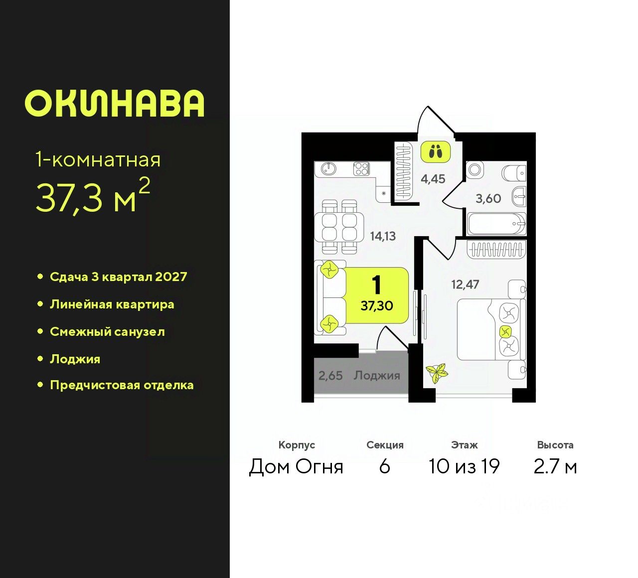 Однокомнатная квартира с предчистовой отделкой в ЖК ''Окинава'' на 10 этаже. Общая площадь: 37.3 кв.м., жилая: 12.47 кв.м., площадь просторной кухни-столовой: 14.13 кв.м. Все окна выходят на одну сторону. В квартире одна лоджия, один совмещенный санузел. Высота потолков 2.7 м. Квартира будет сдана с предчистовой отделкой: на полах стяжка под финишное покрытие, стены подготовлены под покраску или оклейку обоями, разведена вся электрика с подготовкой для установки выключателей и освещения. При желании вы можете заказать отделку под ключ, варианты возможных решений представлены в альбоме фотографий. Дом монолитный, многоподъездный, переменной этажности, от 13 до 19 этажей. Квартира находится в 6-й секции высотой 19 этажей в корпусе Дом Огня. На этаже 12 квартир. В подъезде 2 пассажирских и 1 грузовой лифт. Окончание строительства - 3 квартал 2027 года. Оформление сделки по договору долевого участия. ЖК ''Окинава'' это не просто жилой комплекс, это остров 4 стихий. Они отражаются во внешнем виде фасадов домов, обустройстве дворов и внутреннем оформлении холлов. Каждая из стихий это отдельный дом. Между домами раскинется большой двухуровневый пешеходный бульвар. Первый уровень прогулочный с местами для отдыха, амфитеатром и фонтанами. На втором уровне расположатся площадки для детей, спортивных игр и тренировок. Квартал будет располагать богатой инфраструктурой: на первых этажах разместятся магазины, пекарни, кофейни, пункты выдачи, аптеки, детские центры, цветочные салоны и многое другое, что сделает жизнь поистине комфортной. В жилом комплексе есть кладовые, а также несколько видов паркинга: уличный гостевой, закрытый теплый и паркинг в стилобате, попасть в который можно на лифте с любого жилого этажа. Дворы в каждом доме отражают его стихию, отличаясь по наполнению. Они дополняют друг друга, образуя единое дворовое пространство жилого комплекса. Закрытая территория, свободная от автомобилей, обеспечит безопасность и спокойный отдых. Холлы оформлены керамогранитом, зеркалами и разноуровневым освещением. Витражные входные группы, мягкие зоны ожидания, видеонаблюдение 24/7, вместительные колясочные и даже лапомойки для питомцев всё это будет в ЖК ''Окинава''. Жилой комплекс ''Окинава'' находится в активно развивающемся V заречном микрорайоне, недалеко от озера Алебашево, где в будущем расположится масштабный ивент-парк с зонами отдыха. Удобная транспортная развязка позволит добраться до центра всего за 15 минут. #z4eZ3c
