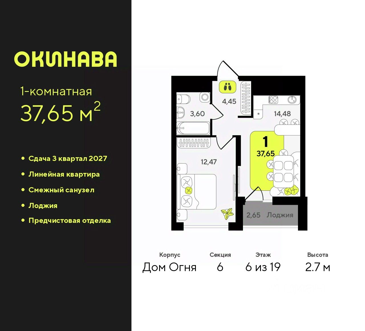 Просторная 1-комн. квартира с предчистовой отделкой в ЖК ''Окинава'' на 6 этаже. Общая площадь: 37.65 кв.м., жилая: 12.47 кв.м., площадь просторной кухни-столовой: 14.48 кв.м. Все окна выходят на одну сторону. В квартире одна лоджия, один совмещенный санузел. Высота потолков 2.7 м. Квартира будет сдана с предчистовой отделкой: на полах стяжка под финишное покрытие, стены подготовлены под покраску или оклейку обоями, разведена вся электрика с подготовкой для установки выключателей и освещения. При желании вы можете заказать отделку под ключ, варианты возможных решений представлены в альбоме фотографий. Дом монолитный, многоподъездный, переменной этажности, от 13 до 19 этажей. Квартира находится в 6-й секции высотой 19 этажей в корпусе Дом Огня. На этаже 12 квартир. В подъезде 2 пассажирских и 1 грузовой лифт. Окончание строительства - 3 квартал 2027 года. Оформление сделки по договору долевого участия. ЖК ''Окинава'' это не просто жилой комплекс, это остров 4 стихий. Они отражаются во внешнем виде фасадов домов, обустройстве дворов и внутреннем оформлении холлов. Каждая из стихий это отдельный дом. Между домами раскинется большой двухуровневый пешеходный бульвар. Первый уровень прогулочный с местами для отдыха, амфитеатром и фонтанами. На втором уровне расположатся площадки для детей, спортивных игр и тренировок. Квартал будет располагать богатой инфраструктурой: на первых этажах разместятся магазины, пекарни, кофейни, пункты выдачи, аптеки, детские центры, цветочные салоны и многое другое, что сделает жизнь поистине комфортной. В жилом комплексе есть кладовые, а также несколько видов паркинга: уличный гостевой, закрытый теплый и паркинг в стилобате, попасть в который можно на лифте с любого жилого этажа. Дворы в каждом доме отражают его стихию, отличаясь по наполнению. Они дополняют друг друга, образуя единое дворовое пространство жилого комплекса. Закрытая территория, свободная от автомобилей, обеспечит безопасность и спокойный отдых. Холлы оформлены керамогранитом, зеркалами и разноуровневым освещением. Витражные входные группы, мягкие зоны ожидания, видеонаблюдение 24/7, вместительные колясочные и даже лапомойки для питомцев всё это будет в ЖК ''Окинава''. Жилой комплекс ''Окинава'' находится в активно развивающемся V заречном микрорайоне, недалеко от озера Алебашево, где в будущем расположится масштабный ивент-парк с зонами отдыха. Удобная транспортная развязка позволит добраться до центра всего за 15 минут. #2wE23D