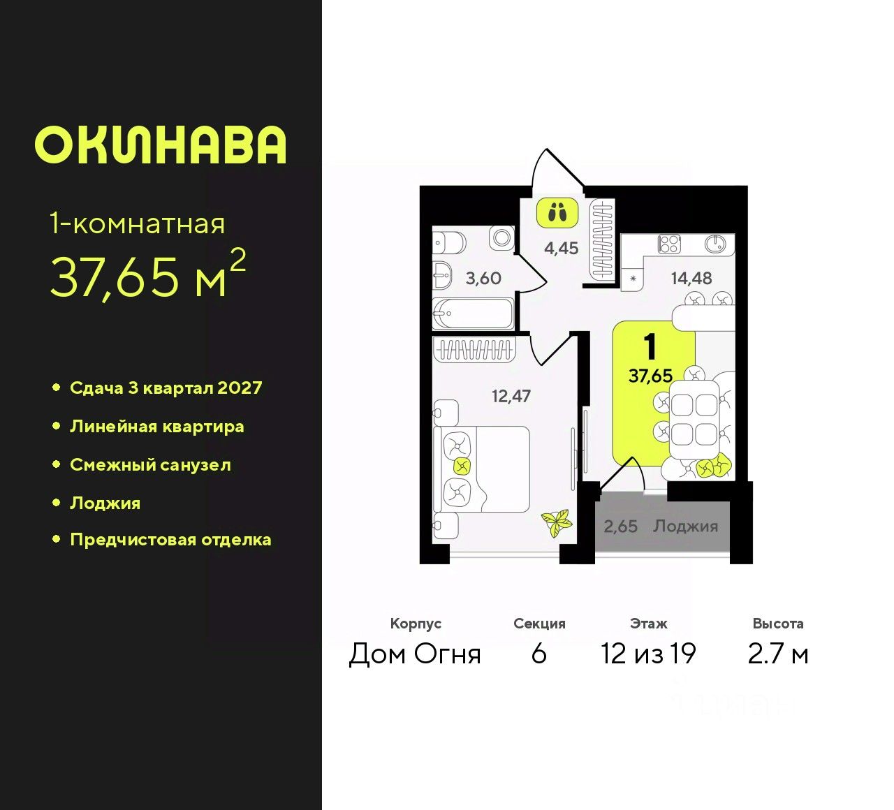 1-комн. квартира с предчистовой отделкой в ЖК ''Окинава'' на 12 этаже. Общая площадь: 37.65 кв.м., жилая: 12.47 кв.м., площадь просторной кухни-столовой: 14.48 кв.м. Все окна выходят на одну сторону. В квартире одна лоджия, один совмещенный санузел. Высота потолков 2.7 м. Квартира будет сдана с предчистовой отделкой: на полах стяжка под финишное покрытие, стены подготовлены под покраску или оклейку обоями, разведена вся электрика с подготовкой для установки выключателей и освещения. При желании вы можете заказать отделку под ключ, варианты возможных решений представлены в альбоме фотографий. Дом монолитный, многоподъездный, переменной этажности, от 13 до 19 этажей. Квартира находится в 6-й секции высотой 19 этажей в корпусе Дом Огня. На этаже 12 квартир. В подъезде 2 пассажирских и 1 грузовой лифт. Окончание строительства - 3 квартал 2027 года. Оформление сделки по договору долевого участия. ЖК ''Окинава'' это не просто жилой комплекс, это остров 4 стихий. Они отражаются во внешнем виде фасадов домов, обустройстве дворов и внутреннем оформлении холлов. Каждая из стихий это отдельный дом. Между домами раскинется большой двухуровневый пешеходный бульвар. Первый уровень прогулочный с местами для отдыха, амфитеатром и фонтанами. На втором уровне расположатся площадки для детей, спортивных игр и тренировок. Квартал будет располагать богатой инфраструктурой: на первых этажах разместятся магазины, пекарни, кофейни, пункты выдачи, аптеки, детские центры, цветочные салоны и многое другое, что сделает жизнь поистине комфортной. В жилом комплексе есть кладовые, а также несколько видов паркинга: уличный гостевой, закрытый теплый и паркинг в стилобате, попасть в который можно на лифте с любого жилого этажа. Дворы в каждом доме отражают его стихию, отличаясь по наполнению. Они дополняют друг друга, образуя единое дворовое пространство жилого комплекса. Закрытая территория, свободная от автомобилей, обеспечит безопасность и спокойный отдых. Холлы оформлены керамогранитом, зеркалами и разноуровневым освещением. Витражные входные группы, мягкие зоны ожидания, видеонаблюдение 24/7, вместительные колясочные и даже лапомойки для питомцев всё это будет в ЖК ''Окинава''. Жилой комплекс ''Окинава'' находится в активно развивающемся V заречном микрорайоне, недалеко от озера Алебашево, где в будущем расположится масштабный ивент-парк с зонами отдыха. Удобная транспортная развязка позволит добраться до центра всего за 15 минут. #ZWE2sT