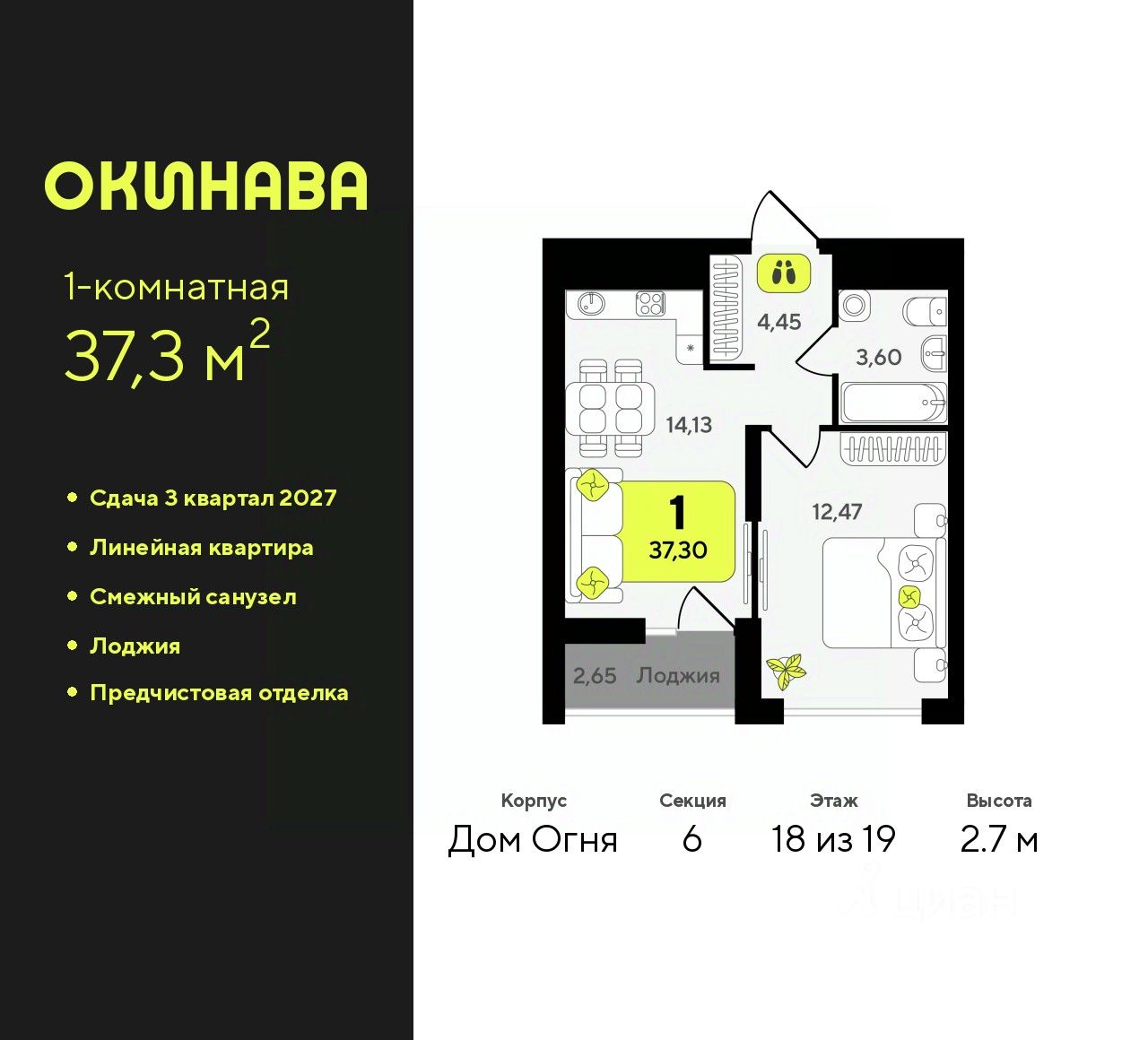 Продается 1-комн. квартира с предчистовой отделкой в ЖК ''Окинава'' на 11 этаже. Общая площадь: 37.3 кв.м., жилая: 12.47 кв.м., площадь просторной кухни-столовой: 14.13 кв.м. Все окна выходят на одну сторону. В квартире одна лоджия, один совмещенный санузел. Высота потолков 2.7 м. Квартира будет сдана с предчистовой отделкой: на полах стяжка под финишное покрытие, стены подготовлены под покраску или оклейку обоями, разведена вся электрика с подготовкой для установки выключателей и освещения. При желании вы можете заказать отделку под ключ, варианты возможных решений представлены в альбоме фотографий. Дом монолитный, многоподъездный, переменной этажности, от 13 до 19 этажей. Квартира находится в 6-й секции высотой 19 этажей в корпусе Дом Огня. На этаже 12 квартир. В подъезде 2 пассажирских и 1 грузовой лифт. Окончание строительства - 3 квартал 2027 года. Оформление сделки по договору долевого участия. ЖК ''Окинава'' это не просто жилой комплекс, это остров 4 стихий. Они отражаются во внешнем виде фасадов домов, обустройстве дворов и внутреннем оформлении холлов. Каждая из стихий это отдельный дом. Между домами раскинется большой двухуровневый пешеходный бульвар. Первый уровень прогулочный с местами для отдыха, амфитеатром и фонтанами. На втором уровне расположатся площадки для детей, спортивных игр и тренировок. Квартал будет располагать богатой инфраструктурой: на первых этажах разместятся магазины, пекарни, кофейни, пункты выдачи, аптеки, детские центры, цветочные салоны и многое другое, что сделает жизнь поистине комфортной. В жилом комплексе есть кладовые, а также несколько видов паркинга: уличный гостевой, закрытый теплый и паркинг в стилобате, попасть в который можно на лифте с любого жилого этажа. Дворы в каждом доме отражают его стихию, отличаясь по наполнению. Они дополняют друг друга, образуя единое дворовое пространство жилого комплекса. Закрытая территория, свободная от автомобилей, обеспечит безопасность и спокойный отдых. Холлы оформлены керамогранитом, зеркалами и разноуровневым освещением. Витражные входные группы, мягкие зоны ожидания, видеонаблюдение 24/7, вместительные колясочные и даже лапомойки для питомцев всё это будет в ЖК ''Окинава''. Жилой комплекс ''Окинава'' находится в активно развивающемся V заречном микрорайоне, недалеко от озера Алебашево, где в будущем расположится масштабный ивент-парк с зонами отдыха. Удобная транспортная развязка позволит добраться до центра всего за 15 минут. #Z4EZub