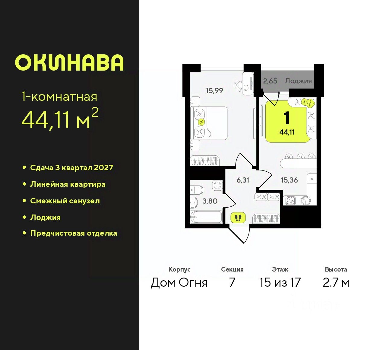 Продается 1-комн. квартира от застройщика с предчистовой отделкой в ЖК ''Окинава'' на 15 этаже. Общая площадь: 44.11 кв.м., жилая: 15.99 кв.м., площадь просторной кухни-столовой: 15.36 кв.м. Все окна выходят на одну сторону. В квартире одна лоджия, один совмещенный санузел. Высота потолков 2.7 м. Квартира будет сдана с предчистовой отделкой: на полах стяжка под финишное покрытие, стены подготовлены под покраску или оклейку обоями, разведена вся электрика с подготовкой для установки выключателей и освещения. При желании вы можете заказать отделку под ключ, варианты возможных решений представлены в альбоме фотографий. Дом монолитный, многоподъездный, переменной этажности, от 13 до 19 этажей. Квартира находится в 7-й секции высотой 17 этажей в корпусе Дом Огня. На этаже 8 квартир. В подъезде 1 пассажирский и 1 грузовой лифт. Окончание строительства - 3 квартал 2027 года. Оформление сделки по договору долевого участия. ЖК ''Окинава'' это не просто жилой комплекс, это остров 4 стихий. Они отражаются во внешнем виде фасадов домов, обустройстве дворов и внутреннем оформлении холлов. Каждая из стихий это отдельный дом. Между домами раскинется большой двухуровневый пешеходный бульвар. Первый уровень прогулочный с местами для отдыха, амфитеатром и фонтанами. На втором уровне расположатся площадки для детей, спортивных игр и тренировок. Квартал будет располагать богатой инфраструктурой: на первых этажах разместятся магазины, пекарни, кофейни, пункты выдачи, аптеки, детские центры, цветочные салоны и многое другое, что сделает жизнь поистине комфортной. В жилом комплексе есть кладовые, а также несколько видов паркинга: уличный гостевой, закрытый теплый и паркинг в стилобате, попасть в который можно на лифте с любого жилого этажа. Дворы в каждом доме отражают его стихию, отличаясь по наполнению. Они дополняют друг друга, образуя единое дворовое пространство жилого комплекса. Закрытая территория, свободная от автомобилей, обеспечит безопасность и спокойный отдых. Холлы оформлены керамогранитом, зеркалами и разноуровневым освещением. Витражные входные группы, мягкие зоны ожидания, видеонаблюдение 24/7, вместительные колясочные и даже лапомойки для питомцев всё это будет в ЖК ''Окинава''. Жилой комплекс ''Окинава'' находится в активно развивающемся V заречном микрорайоне, недалеко от озера Алебашево, где в будущем расположится масштабный ивент-парк с зонами отдыха. Удобная транспортная развязка позволит добраться до центра всего за 15 минут. #z4EzMu