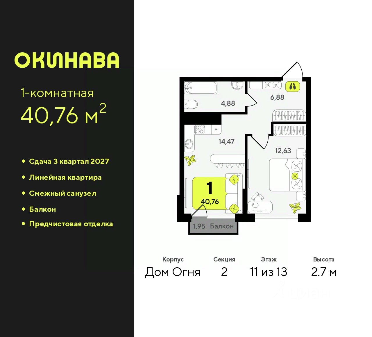 Однокомнатная квартира с предчистовой отделкой в ЖК ''Окинава'' на 11 этаже. Общая площадь: 40.76 кв.м., жилая: 12.63 кв.м., площадь просторной кухни-столовой: 14.47 кв.м. Все окна выходят на одну сторону. В квартире один балкон, один совмещенный санузел. Высота потолков 2.7 м. Квартира будет сдана с предчистовой отделкой: на полах стяжка под финишное покрытие, стены подготовлены под покраску или оклейку обоями, разведена вся электрика с подготовкой для установки выключателей и освещения. При желании вы можете заказать отделку под ключ, варианты возможных решений представлены в альбоме фотографий. Дом монолитный, многоподъездный, переменной этажности, от 13 до 19 этажей. Квартира находится во 2-й секции высотой 13 этажей в корпусе Дом Огня. На этаже 5 квартир. В подъезде 1 пассажирский и 1 грузовой лифт. Окончание строительства - 3 квартал 2027 года. Оформление сделки по договору долевого участия. ЖК ''Окинава'' это не просто жилой комплекс, это остров 4 стихий. Они отражаются во внешнем виде фасадов домов, обустройстве дворов и внутреннем оформлении холлов. Каждая из стихий это отдельный дом. Между домами раскинется большой двухуровневый пешеходный бульвар. Первый уровень прогулочный с местами для отдыха, амфитеатром и фонтанами. На втором уровне расположатся площадки для детей, спортивных игр и тренировок. Квартал будет располагать богатой инфраструктурой: на первых этажах разместятся магазины, пекарни, кофейни, пункты выдачи, аптеки, детские центры, цветочные салоны и многое другое, что сделает жизнь поистине комфортной. В жилом комплексе есть кладовые, а также несколько видов паркинга: уличный гостевой, закрытый теплый и паркинг в стилобате, попасть в который можно на лифте с любого жилого этажа. Дворы в каждом доме отражают его стихию, отличаясь по наполнению. Они дополняют друг друга, образуя единое дворовое пространство жилого комплекса. Закрытая территория, свободная от автомобилей, обеспечит безопасность и спокойный отдых. Холлы оформлены керамогранитом, зеркалами и разноуровневым освещением. Витражные входные группы, мягкие зоны ожидания, видеонаблюдение 24/7, вместительные колясочные и даже лапомойки для питомцев всё это будет в ЖК ''Окинава''. Жилой комплекс ''Окинава'' находится в активно развивающемся V заречном микрорайоне, недалеко от озера Алебашево, где в будущем расположится масштабный ивент-парк с зонами отдыха. Удобная транспортная развязка позволит добраться до центра всего за 15 минут. #zWe2M6
