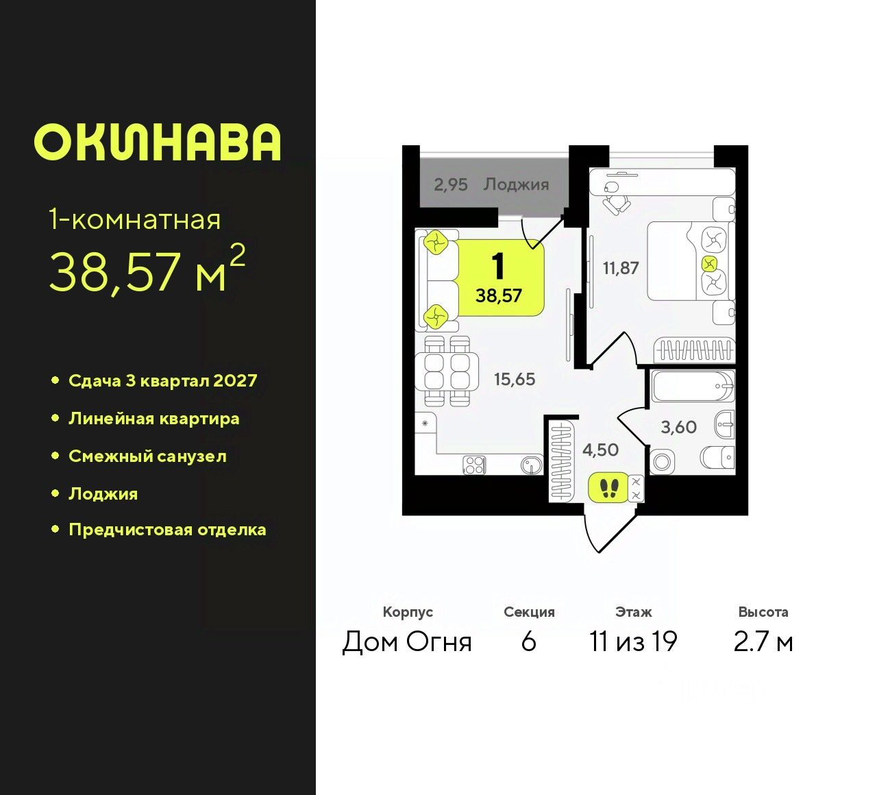 Продается 1-комн. квартира с предчистовой отделкой в ЖК ''Окинава'' на 11 этаже. Общая площадь: 38.57 кв.м., жилая: 11.87 кв.м., площадь просторной кухни-столовой: 15.65 кв.м. Все окна выходят на одну сторону. В квартире одна лоджия, один совмещенный санузел. Высота потолков 2.7 м. Квартира будет сдана с предчистовой отделкой: на полах стяжка под финишное покрытие, стены подготовлены под покраску или оклейку обоями, разведена вся электрика с подготовкой для установки выключателей и освещения. При желании вы можете заказать отделку под ключ, варианты возможных решений представлены в альбоме фотографий. Дом монолитный, многоподъездный, переменной этажности, от 13 до 19 этажей. Квартира находится в 6-й секции высотой 19 этажей в корпусе Дом Огня. На этаже 12 квартир. В подъезде 2 пассажирских и 1 грузовой лифт. Окончание строительства - 3 квартал 2027 года. Оформление сделки по договору долевого участия. ЖК ''Окинава'' это не просто жилой комплекс, это остров 4 стихий. Они отражаются во внешнем виде фасадов домов, обустройстве дворов и внутреннем оформлении холлов. Каждая из стихий это отдельный дом. Между домами раскинется большой двухуровневый пешеходный бульвар. Первый уровень прогулочный с местами для отдыха, амфитеатром и фонтанами. На втором уровне расположатся площадки для детей, спортивных игр и тренировок. Квартал будет располагать богатой инфраструктурой: на первых этажах разместятся магазины, пекарни, кофейни, пункты выдачи, аптеки, детские центры, цветочные салоны и многое другое, что сделает жизнь поистине комфортной. В жилом комплексе есть кладовые, а также несколько видов паркинга: уличный гостевой, закрытый теплый и паркинг в стилобате, попасть в который можно на лифте с любого жилого этажа. Дворы в каждом доме отражают его стихию, отличаясь по наполнению. Они дополняют друг друга, образуя единое дворовое пространство жилого комплекса. Закрытая территория, свободная от автомобилей, обеспечит безопасность и спокойный отдых. Холлы оформлены керамогранитом, зеркалами и разноуровневым освещением. Витражные входные группы, мягкие зоны ожидания, видеонаблюдение 24/7, вместительные колясочные и даже лапомойки для питомцев всё это будет в ЖК ''Окинава''. Жилой комплекс ''Окинава'' находится в активно развивающемся V заречном микрорайоне, недалеко от озера Алебашево, где в будущем расположится масштабный ивент-парк с зонами отдыха. Удобная транспортная развязка позволит добраться до центра всего за 15 минут. #zWe2tu