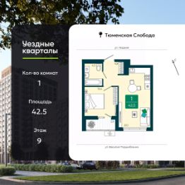 Однокомнатная квартира в ЖК ''Уездные кварталы'' на 9 этаже. Квартира без отделки, полностью готова к чистовой отделке и дальнейшему ремонту. Общая площадь: 42.5 кв.м., жилая: 10.5 кв.м., площадь просторной кухни-столовой: 20.5 кв.м. Все окна выходят на одну сторону. В квартире одна лоджия, один совмещенный санузел. Высота потолков 2.72 м. Дом монолитный, черырехподъездный, переменной этажности, от 9 до 16 этажей. Квартира находится в 4-й секции высотой 9 этажей в корпусе ГП-5.2. На этаже 6 квартир. В подъезде 1 пассажирский и 1 грузовой лифт. Окончание строительства - 4 квартал 2026 года. Оформление сделки по договору долевого участия. ''Уездные кварталы'' - семейный жилой комплекс комфорт-класса с авторской архитектурой и трехуровневым ландшафтным озеленением. Рядом расположены крупные транспортные развязки, которые позволяют добраться в любую точку города за 15 минут. Жилой комплекс находится в современном районе с развитой инфраструктурой, на первой линии Тюменской Слободы. Вокруг есть всё необходимое в шаговой доступности: новые детские сады и школы, остановки общественного транспорта, магазины, кафе и рестораны, поликлиника, детская школа искусств, парки и спортивный комплекс. На первых этажах квартала расположена собственная коммерческая сеть, а также свой соседский центр. Проект включает 5 домов переменной этажности с более чем 100 планировками - с террасами, французскими балконами и мастер-спальнями. Закрытые дворы оборудованы интерактивными площадками для игр, спортивными зонами и местами тихого отдыха. Вдоль жилого комплекса расположен пешеходный бульвар с сухим фонтаном, а для автомобилей предусмотрен теплый паркинг. Часть квартир можно приобрести с ремонтом, мебелью и техникой от застройщика, а расходы включить в ипотечный платеж. #Zm5E3B