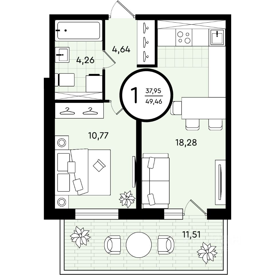 Квартира 1 с видом на двор и природный сквер •Удобная кухня с выделенной зоной, которую вы можете использовать как кабинет или зону отдыха •Просторная спальня с выходом на французский балкон •Вместительный коридор с нишей под шкаф-купе •Санузел, где вместится все необходимое