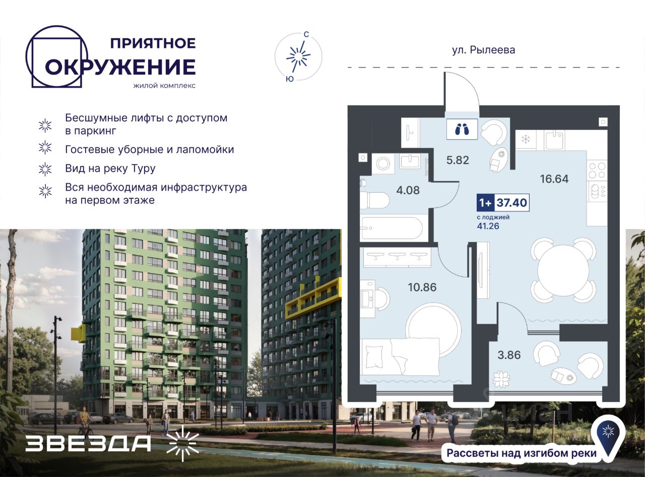 ЖК Этика - культурные кварталы рядом с Алебашевским озером и тремя парками. Новый проект застройщика ''ТИС'' на пересечении улиц Алебашевская и Тимофея Кармацких. Расположение Жилой комплекс расположен на левом берегу Туры, в прибрежной зоне озера Алебашево. Всего 10 минут на автомобиле и вы в самом центре города. Рядом, на улице Тимофея Кармацкого, расположен современный гастрорынок ''Алебашевский Базар'', через дорогу ТЦ ''Зеленый берег'' с гипермаркетом ''Лента''. Здесь много возможностей для прогулок: в 900 метрах от ЖК - Парк дружбы между Россией и Республикой Корея, в 5 минутах езды на автомобиле Ватутинская роща и Гагаринский парк. Модная эко-локация ЖК расположен в уникальном месте, инфраструктура района вполне может посоперничать с центром. Все что нужно для повседневного комфорта жителей: аптеки, фитнес-клубы, уютные студии йоги, гастропабы и супермаркеты - находится в пешей доступности. Район с особой, редкой в мегаполисе экосистемой - рядом сразу с тремя водными объектами: Алебашевским озером, озером Круглое и рекой Турой. В 5 минутах езды на авто - лесопарк имени Гагарина. На площади в 105 га прорастают около 200 видов редких растений и обитает более 70 видов птиц, поэтому парк стал памятником природы регионального значения. ''Зеленый каркас'' Жилой район спроектирован по принципу квартальной застройки. Между собой кварталы соединяет ''зеленый каркас'' - пешеходная аллея, пронизывающей всю территорию ЖК. Мы планируем засадить ее взрослыми деревьями, разбить газоны и цветники. Бульвар в центре ЖК В центральной части комплекса на площади 1,65 га мы обустроим бульвар с ландшафтным озеленением. Здесь разместятся арт-объекты, разнообразные зоны для игр и отдыха, качели и шезлонги. Бульвар станет центром притяжения для всего района. Дворовое пространство Организовано по принципу безбарьерной среды, свободной от машин. Все площадки для шумных командных игр также вынесены за пределы двора. Игровые зоны спланированы так, чтобы удобно было и детям, и родителям. Качели, песочницы и разнообразные спортивные зоны хорошо просматриваются, но расположены на достаточном расстоянии, и юные жители в разгар игр не помешают взрослым. В центре двора в первом квартале мы обустроим мини-площадь с живой елью. Эргономичные планировки При проектировании мы использовали лучшие решения, проверенные в других наших проектах + добавили новые трендовые элементы. Например, есть лоты с отдельным входом и террасами, с окном в ванной или панорамным остеклением. В квартирах от двух комнат спланированы мастер-спальни с собственным санузлом и гардеробной. Также в многокомнатных квартирах есть возможность разделить пространство на гостевую и приватную зоны. Сдача 1 очереди - II квартал 2026 года Сдача 2 очереди - IV квартал 2026 года
