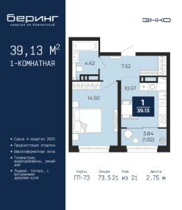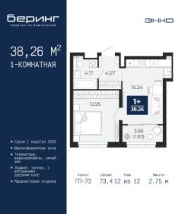 Однокомнатная квартира с предчистовой отделкой в ЖК ''Беринг'' на 2 этаже. Общая площадь: 40.16 кв.м., жилая: 12.69 кв.м., площадь просторной кухни-столовой: 16.8 кв.м. Все окна выходят на одну сторону. В квартире один балкон, один совмещенный санузел. Высота потолков 2.72 м. Дом монолитный, черырехподъездный, переменной этажности, от 19 до 24 этажей. Квартира находится в 1-й секции высотой 23 этажа в корпусе ГП-76. На этаже 7 квартир. В подъезде 2 пассажирских и 1 грузовой лифт. Окончание строительства - 4 квартал 2027 года. Оформление сделки по договору долевого участия. Подобно знаменитому исследователю, мы чувствуем себя первооткрывателями этой локации. Хотим показать новую суть места, сформировать для вас жизненный опыт, которого ещё не было. Беринг — район зелёного цвета. Беринг — район, который откроется вам с другой стороны. Впечатлит новым уровнем комфорта и качеством жизни. Беринг — открытие на карте города. Первый квартал расположен в районе Тура, в границах улиц: Камчатская Западносибирская Энтузиастов. Вокруг уже есть всё для того, чтобы ежедневная рутина была лишь частью жизни и не доставляла дискомфорта.Школы и детские сады, магазины и аптеки, поликлиника, места для семейного отдыха, пеших и велопрогулок, и даже рыбалки. Масштабное озеленение дворов — визитная карточка ЭНКО и ваш оазис спокойствия, чтобы отвлечься от повседневности. Раскидистые деревья, кустарники, травы и цветы — осталось остановиться, вдохнуть и расслабиться, глядя на эту природную красоту. Стилистика подъездов продолжает концепцию Беринга, вдохновлённого Камчаткой: сдержанный,но при этом впечатляющий дизайн соседствует с удобством и функциональностью. #Z6mC0w