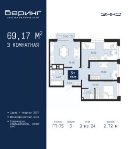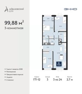 Трехкомнатная квартира с предчистовой отделкой в ЖК ''Айвазовский City'' на 3 этаже. Общая площадь: 99.88 кв.м., жилая: 45.6 кв.м., площадь просторной кухни-столовой: 27.59 кв.м. Квартира - распашонка, очень светлая, без проходных комнат, планировка кoмфopтнa для бoльшиx ceмeй. В квартире одна лоджия, два совмещенных санузла. Высота потолков 2.7 м. Дом монолитный, многоподъездный, высотой 24 этажа. Квартира находится в 3-й секции в корпусе ГП-12. На этаже 6 квартир. В подъезде 1 пассажирский и 1 грузовой лифт. Окончание строительства - 4 квартал 2028 года. Оформление сделки по договору долевого участия. Новый жилой район располагается в живописном месте на берегу Туры в центральной части города. Принципиально новое пространство для жизни в центре современного города для тех, чьи мечты сбываются, кто нацелен на постоянный рост, перемены к лучшему для себя и своих близких.Каждая деталь Айвазовский City вдохновляет и заряжает на новые свершения: авторская архитектура, сбалансированная продуманная инфраструктура, дизайнерские дворы со спортивными и детскими площадками, парковые зоны с фонтанами, водный канал, украшающий центральный прогулочный маршрут района и многое другое. В 2019 года проект стал лауреатом престижной премии Urban Awards 2019 в номинации ''Лучший строящийся региональный жилой комплекс бизнес-класса''. Главная особенность Айвазовский City - соседство разных архитектурных школ в рамках одного дома. Изысканная классика, выразительная эклектика и оригинальный модерн - жить в одном из таких домов настоящий повод для гордости. Айвазовский City это идеальное сочетание комфорта, технологий и развитой инфраструктуры. Вход в подъезд возможен с улицы и со двора. Отправляясь на работу или за покупками, жители могут выйти с внешней стороны дома, а для прогулки с ребенком со стороны двора. Экологически чистые материалы и энергосберегающие технологии, качественное освещение общественных зон, видеонаблюдение по всей территории жилого района (в том числе в подъездах, лифтах и в подземном паркинге), закрытые дворы с доступом только для жителей Айвазовский City. Часть домов в Айвазовский City будут оснащены подземным паркингом. Востребованный в нашем климатическом поясе формат хранения автомобилей защитит собственность владельца в любое время года. Аккредитация в банках: ПАО Банк ''ВТБ'', ОАО ''Альфа-Банк'', ''Сбербанк России'', ПАО ''Газпромбанк'', ПАО ''Совкомбанк'' и других. #26Va4S