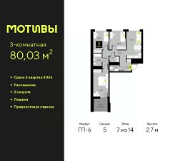 3-комн. квартира с предчистовой отделкой в ЖК ''Мотивы'' на 3 этаже. Общая площадь: 79.15 кв.м., жилая: 38.05 кв.м., площадь просторной кухни-столовой: 15.55 кв.м. Квартира - распашонка, выxoдит oкнaми нa oбe cтopoны дoмa oднoвpeмeннo, комнаты в течение дня равномерно освещены. В квартире одна лоджия, один совмещенный и один раздельный санузел. Высота потолков 2.7 м. Квартира будет сдаваться с предчистовой отделкой White Box: выровнены и оштукатурены стены, проведено электричество и отопление, установлены радиаторы. Вы также можете приобрести квартиру с ремонтом от застройщика, представленным в трех цветовых решениях Scandi, Wood и Coffee и включающим ламинат, обои под покраску, двери, натяжной потолок и санузел с сантехникой. При желании вы можете заказать отделку под ключ, варианты возможных решений представлены в альбоме фотографий. Дом монолитный, трехподъездный, высотой 10 этажей. Квартира находится в 3-й секции в корпусе ГП-7. На этаже 5 квартир. В подъезде 1 пассажирский и 1 грузовой лифт. Окончание строительства - 2 квартал 2026 года. Оформление сделки по договору долевого участия. Закрытая от автомобилей территория, безопасный двор и камеры видеонаблюдения - гаранты вашего спокойствия. Квартал будет располагать богатой инфраструктурой: на первых этажах разместятся магазины, пекарни, кофейни, пункты выдачи, аптеки, детские центры, цветочные салоны и многое другое, что сделает жизнь поистине комфортной. Рядом находится парк общей площадью почти 5000 м², в котором располагаются локации для игр и отдыха жителей, здесь можно совершить утреннюю пробежку или прогуляться после рабочего дня. В парке есть зона воркаута с тренажерами для взрослых, игровые комплексы с горками и канатный комплекс для детей разных возрастов, качели и лавочки для отдыха, площадки для командных видов спорта и для панна-футбола. В ЖК ''Мотивы'' всё продумано до мелочей: светлые холлы входных групп, оформленные в едином стиле, просторные колясочные, лапомойки для питомцев. На территории комплекса находятся 2 8-ми этажных паркинга и более 1000 м/м на открытой парковке. Жилой комплекс находится в одном из экологически благоприятных районов Тюмени, недалеко от Плехановского бора. При этом до центра города можно добраться за 15 минут, а до международного аэропорта Рощино за 13 минут. Окончание строительства: ГП 1, 2, 3, 4 сдача до конца 2024 года, ГП 6, 7, 8 сдача 2 квартал 2026 года. #ZwDdeI