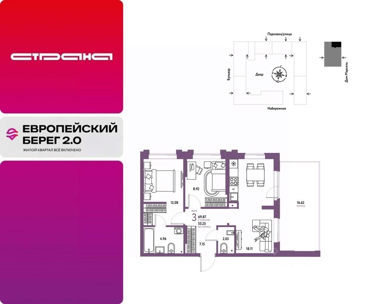 Объявление от застройщика Страна Девелопмент. Покупка квартиры защищена банком. Продается 3комнатная квартира на 21 этаже от застройщика Страна Девелопмент. Площадь квартиры 69,87 кв. м. Стоимость указана без учета акций. Европейский берег 2.0. — это продолжение легендарного жилого комплекса Европейский берег. Он включает все, что нужно для жизни, и даже больше. Этот квартал для тех, кто не готов тратить время на ненужное, жертвовать одним ради другого. Для тех, кто хочет получить все и сразу. Именно поэтому генеральная идея проекта — жилой квартал все включено. Все преимущества включены. Никаких исключений. ПРЕИМУЩЕСТВА Разнообразие планировок: от классических до квартир с мастер-спальней и террасами. Подземный паркинг с кладовыми, охраной и видеонаблюдением 24/7. Ремонт от застройщика: 5 вариантов на выбор. Закрытый двор с площадками и зонами отдыха: мост-акведук, тренажёры, лабиринты, гамаки и шезлонги. ОТДЕЛКА Базовая отделка или готовый ремонт от застройщика. В базовой отделке все черновые работы выполнены, подведены коммуникации, стены оштукатурены под маяк. В ремонт от застройщика входит 5 вариантов отделки, уже включено всё необходимое: от сантехники до кондиционера. СПОСОБЫ ПОКУПКИ Сотрудники ''Страны Девелопмент'' будут сопровождать вас на каждом этапе сделки, помогут получить одобрение по ипотеке или снизить ежемесячный платеж. - ипотека - материнский капитал - 100% оплата наличными - рассрочка - обмен — это выкуп вашей старой квартиры и зачисление полученных денежных средств в счет стоимости новой квартиры или в качестве первоначального взноса по ипотеке.