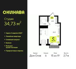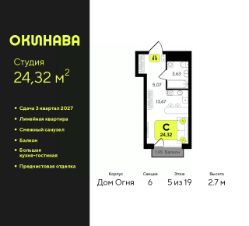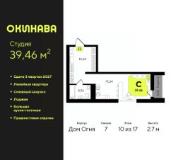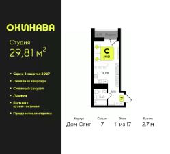 1-комн. квартира-студия от застройщика с предчистовой отделкой в ЖК ''Окинава'' на 7 этаже. Общая площадь: 29.51 кв.м., площадь гостиной 18.08 кв.м., из которых 5 кв.м. выделено под кухонную зону. Все окна выходят на одну сторону. В квартире одна лоджия, один совмещенный санузел. Высота потолков 2.7 м. Квартира будет сдана с предчистовой отделкой: на полах стяжка под финишное покрытие, стены подготовлены под покраску или оклейку обоями, разведена вся электрика с подготовкой для установки выключателей и освещения. При желании вы можете заказать отделку под ключ, варианты возможных решений представлены в альбоме фотографий. Дом монолитный, многоподъездный, переменной этажности, от 13 до 19 этажей. Квартира находится в 7-й секции высотой 17 этажей в корпусе Дом Огня. На этаже 8 квартир. В подъезде 1 пассажирский и 1 грузовой лифт. Окончание строительства - 3 квартал 2027 года. Оформление сделки по договору долевого участия. ЖК ''Окинава'' это не просто жилой комплекс, это остров 4 стихий. Они отражаются во внешнем виде фасадов домов, обустройстве дворов и внутреннем оформлении холлов. Каждая из стихий это отдельный дом. Между домами раскинется большой двухуровневый пешеходный бульвар. Первый уровень прогулочный с местами для отдыха, амфитеатром и фонтанами. На втором уровне расположатся площадки для детей, спортивных игр и тренировок. Квартал будет располагать богатой инфраструктурой: на первых этажах разместятся магазины, пекарни, кофейни, пункты выдачи, аптеки, детские центры, цветочные салоны и многое другое, что сделает жизнь поистине комфортной. В жилом комплексе есть кладовые, а также несколько видов паркинга: уличный гостевой, закрытый теплый и паркинг в стилобате, попасть в который можно на лифте с любого жилого этажа. Дворы в каждом доме отражают его стихию, отличаясь по наполнению. Они дополняют друг друга, образуя единое дворовое пространство жилого комплекса. Закрытая территория, свободная от автомобилей, обеспечит безопасность и спокойный отдых. Холлы оформлены керамогранитом, зеркалами и разноуровневым освещением. Витражные входные группы, мягкие зоны ожидания, видеонаблюдение 24/7, вместительные колясочные и даже лапомойки для питомцев всё это будет в ЖК ''Окинава''. Жилой комплекс ''Окинава'' находится в активно развивающемся V заречном микрорайоне, недалеко от озера Алебашево, где в будущем расположится масштабный ивент-парк с зонами отдыха. Удобная транспортная развязка позволит добраться до центра всего за 15 минут. #zWE1u5