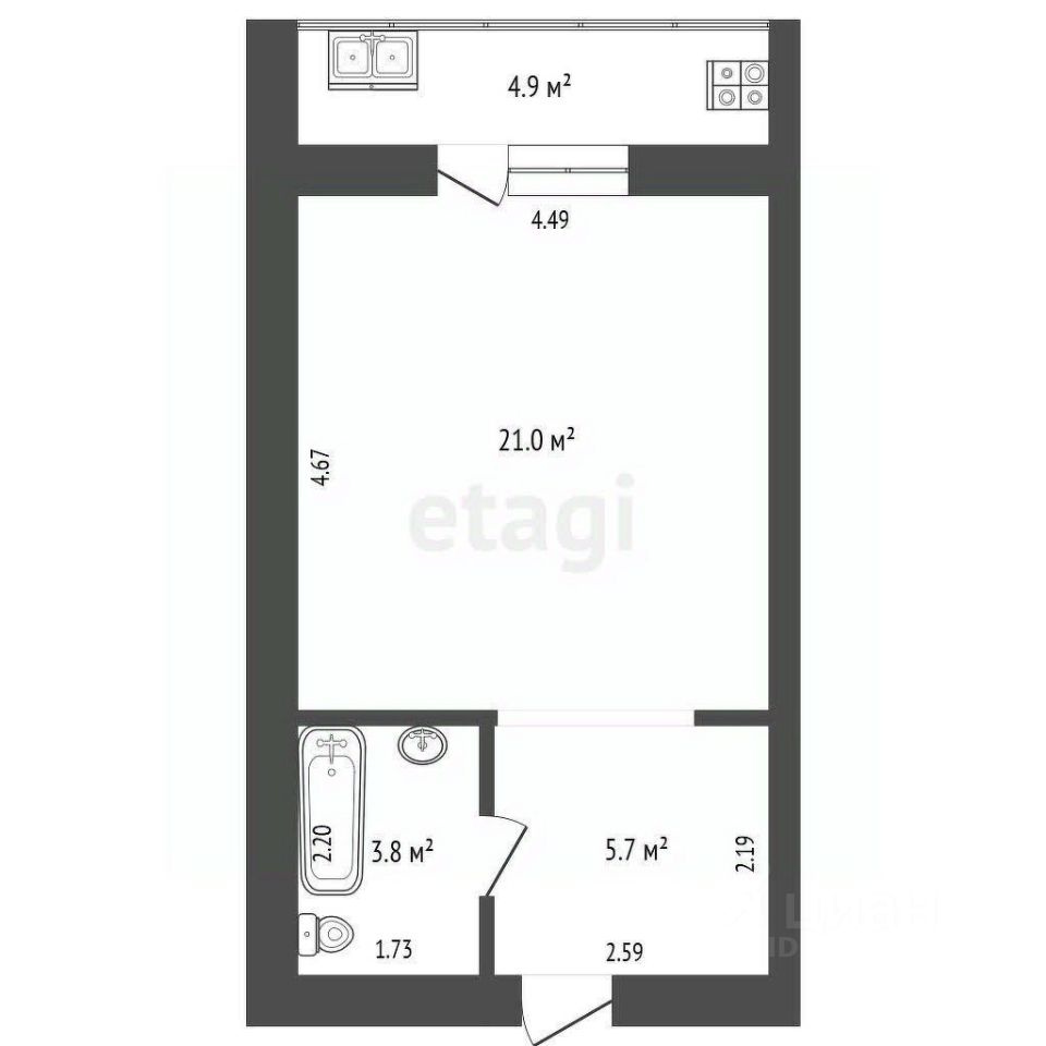 Уютная студия с просторной ванной и прихожей, в которой предусмотрена ниша для хранения. В кухне-гостиной органично зонировано пространство на нишу для приготовления, обеденную зону и место для отдыха. Подойдет для студентов и свободных молодых людей.