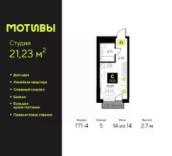1-комн. квартира-студия с предчистовой отделкой в ЖК ''Мотивы'' на 14 этаже. Общая площадь: 21.23 кв.м., площадь гостиной 13.29 кв.м., из которых 5 кв.м. выделено под кухонную зону. Все окна выходят на одну сторону. В квартире один балкон, один совмещенный санузел. Высота потолков 2.7 м. Квартира будет сдаваться с предчистовой отделкой White Box: выровнены и оштукатурены стены, проведено электричество и отопление, установлены радиаторы. Вы также можете приобрести квартиру с ремонтом от застройщика, представленным в трех цветовых решениях Scandi, Wood и Coffee и включающим ламинат, обои под покраску, двери, натяжной потолок и санузел с сантехникой. При желании вы можете заказать отделку под ключ, варианты возможных решений представлены в альбоме фотографий. Дом монолитный, многоподъездный, переменной этажности, от 5 до 14 этажей. Квартира находится в 5-й секции высотой 14 этажей в корпусе ГП-4. На этаже 5 квартир. В подъезде 1 пассажирский и 1 грузовой лифт. Строительство завершено, дом сдан в 4 квартале 2024 года. Оформление сделки по договору купли-продажи. Закрытая от автомобилей территория, безопасный двор и камеры видеонаблюдения - гаранты вашего спокойствия. Квартал будет располагать богатой инфраструктурой: на первых этажах разместятся магазины, пекарни, кофейни, пункты выдачи, аптеки, детские центры, цветочные салоны и многое другое, что сделает жизнь поистине комфортной. Рядом находится парк общей площадью почти 5000 м², в котором располагаются локации для игр и отдыха жителей, здесь можно совершить утреннюю пробежку или прогуляться после рабочего дня. В парке есть зона воркаута с тренажерами для взрослых, игровые комплексы с горками и канатный комплекс для детей разных возрастов, качели и лавочки для отдыха, площадки для командных видов спорта и для панна-футбола. В ЖК ''Мотивы'' всё продумано до мелочей: светлые холлы входных групп, оформленные в едином стиле, просторные колясочные, лапомойки для питомцев. На территории комплекса находятся 2 8-ми этажных паркинга и более 1000 м/м на открытой парковке. Жилой комплекс находится в одном из экологически благоприятных районов Тюмени, недалеко от Плехановского бора. При этом до центра города можно добраться за 15 минут, а до международного аэропорта Рощино за 13 минут. Окончание строительства: ГП 1, 2, 3, 4 сдача до конца 2024 года, ГП 6, 7, 8 сдача 2 квартал 2026 года. #zWeO0c