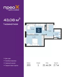 Спешите оформить бронирование на этих условиях, срок акции ограничен! Стоимость квартиры указана со скидкой, ваша экономия составит 613,000 руб. Звоните, наши менеджеры вам все расскажут. Продается 1-комн. квартира от застройщика с предчистовой отделкой в ЖК ''Прео'' на 21 этаже. Общая площадь: 43.08 кв.м., жилая: 14 кв.м., площадь просторной кухни-столовой: 15.98 кв.м. Все окна выходят на одну сторону. В квартире один совмещенный санузел. Высота потолков 2.7 м. Квартира находится в корпусе 203. Дом монолитный, одноподъездный, высотой 24 этажа. На этаже 14 квартир. В подъезде 2 грузовых лифта. Строительство окончено, дом сдан в 4 квартале 2024 года. Оформление сделки по договору купли-продажи. Преображенский — один из самых привлекательных районов для жизни! Это полностью самостоятельный жилой район с точки зрения инфраструктуры. Преображенский находится между Московским и Червишевским трактами в квартале улиц Закалужская — Вьюжная — Александра Протозанова. Не нужно ждать, когда появится инфраструктура — переезжайте на всё готовое. Вблизи расположены действующие школа и детский сад. В этом году откроется еще один сад, а в следующем году — школа. По соседству с Преображенским запланировано строительство городского парка ''Комарово'' площадью 38 гектар. За 10 минут можно доехать на автомобиле до крупных ТРЦ: ''Лента'', ''Кристалл'', ''Леруа Мерлен'', ''Метро'' и ''Ашан''. С 2018 года в районе открыт Соседский центр — пространство, созданное для формирования добрососедской среды, совместного досуга, общения и реализации соседских инициатив. Здесь проходят встречи соседей, а также сами жители района организовывают мероприятия. Организатором такого события может стать любой желающий. В квартирах выполнена качественная предчистовая отделка. Гладкие стены с финишным выравниванием по маякам. Ровный потолок для установки натяжного потолка. Установлены пятикамерные окна с двойным стеклопакетом (3 стекла). Дизайнерские холлы с видеонаблюдением, безбарьерным и прозрачным входом всегда светло и спокойно. На первом этаже есть просторные колясочные, где все жители могут оставлять свои коляски и велосипеды. В Преображенском есть всё, что нужно для активного отдыха и занятий спортом. Мы сделали большое футбольное поле с безопасным покрытием. Также установили хоккейный корт, который оборудован по всем необходимым стандартам. Во дворах можно делать упражнения на специальных площадках с турниками. Весь район мы обустроили велодорожками, которые связаны в единый маршрут. У нас есть сухие фонтаны, бьющие из земли, деревья, веревки, сетки, скалодром, газон, песок и резинка — осталось просто дать своему ребенку право на свободную игру. По-настоящему хорошие дворы — это те, которые дети предпочитают соцсетям и телевизору. Аккредитация в банках: ОАО ''Альфа-Банк'', ''Сбербанк России'', ПАО ''Банк Уралсиб'', ПАО ''Газпромбанк'', ПАО Банк ''ВТБ'' и других. #z2C4Z3
