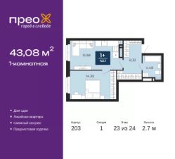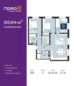 Просторная 3-комн. квартира с предчистовой отделкой в ЖК ''Прео'' на 20 этаже. Общая площадь: 83.64 кв.м., жилая: 35.03 кв.м., площадь просторной кухни-столовой: 27.41 кв.м. Квартира угловая, идеально подойдет любителям тишины и панорамных видов. В квартире два совмещенных санузла. Высота потолков 2.7 м. Квартира находится в корпусе 204. Дом монолитный, одноподъездный, высотой 24 этажа. На этаже 14 квартир. В подъезде 2 грузовых лифта. Строительство окончено, дом сдан в 4 квартале 2024 года. Оформление сделки по договору купли-продажи. Преображенский — один из самых привлекательных районов для жизни! Это полностью самостоятельный жилой район с точки зрения инфраструктуры. Преображенский находится между Московским и Червишевским трактами в квартале улиц Закалужская — Вьюжная — Александра Протозанова. Не нужно ждать, когда появится инфраструктура — переезжайте на всё готовое. Вблизи расположены действующие школа и детский сад. В этом году откроется еще один сад, а в следующем году — школа. По соседству с Преображенским запланировано строительство городского парка ''Комарово'' площадью 38 гектар. За 10 минут можно доехать на автомобиле до крупных ТРЦ: ''Лента'', ''Кристалл'', ''Леруа Мерлен'', ''Метро'' и ''Ашан''. С 2018 года в районе открыт Соседский центр — пространство, созданное для формирования добрососедской среды, совместного досуга, общения и реализации соседских инициатив. Здесь проходят встречи соседей, а также сами жители района организовывают мероприятия. Организатором такого события может стать любой желающий. В квартирах выполнена качественная предчистовая отделка. Гладкие стены с финишным выравниванием по маякам. Ровный потолок для установки натяжного потолка. Установлены пятикамерные окна с двойным стеклопакетом (3 стекла). Дизайнерские холлы с видеонаблюдением, безбарьерным и прозрачным входом всегда светло и спокойно. На первом этаже есть просторные колясочные, где все жители могут оставлять свои коляски и велосипеды. В Преображенском есть всё, что нужно для активного отдыха и занятий спортом. Мы сделали большое футбольное поле с безопасным покрытием. Также установили хоккейный корт, который оборудован по всем необходимым стандартам. Во дворах можно делать упражнения на специальных площадках с турниками. Весь район мы обустроили велодорожками, которые связаны в единый маршрут. У нас есть сухие фонтаны, бьющие из земли, деревья, веревки, сетки, скалодром, газон, песок и резинка — осталось просто дать своему ребенку право на свободную игру. По-настоящему хорошие дворы — это те, которые дети предпочитают соцсетям и телевизору. Аккредитация в банках: ПАО ''Банк Уралсиб'', ''Сбербанк России'', ПАО Банк ''ВТБ'', ОАО ''Альфа-Банк'', ПАО ''Газпромбанк'' и других. #22c4EA