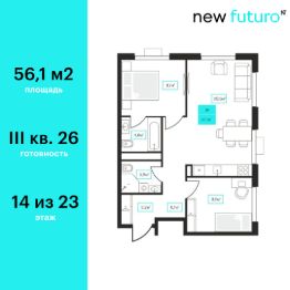 Продаётся 2-комнатная квартира в строящемся доме (Дом 6к1), срок сдачи: III-кв. 2026, общей площадью 55.9 кв.м., на 21 этаже. Новый жилой комплекс ''Futuro'' от застройщика ''newton'' расположен в г. Тюмень на Ставропольской улице.