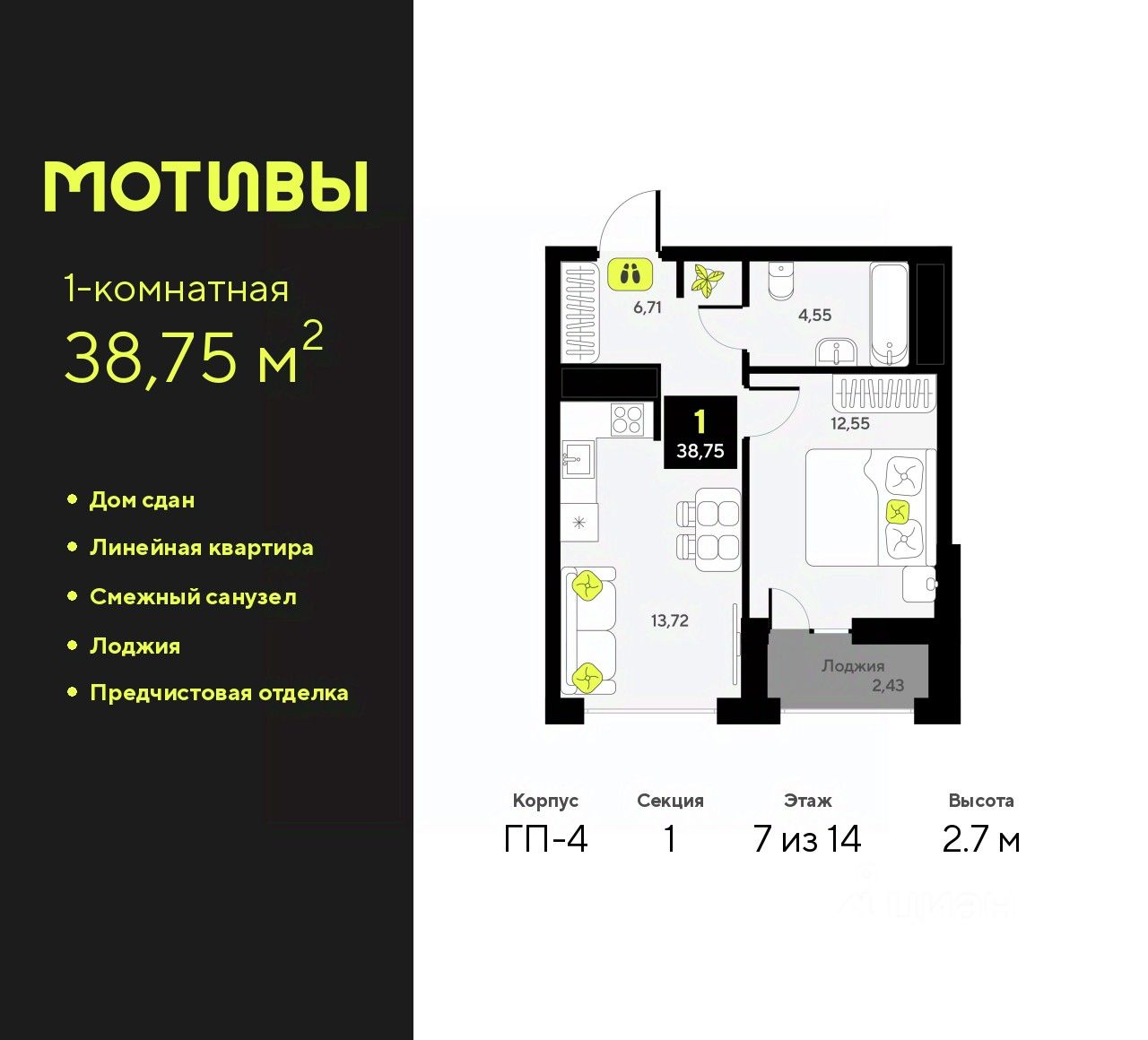 Просторная 1-комн. квартира с предчистовой отделкой в ЖК ''Мотивы'' на 7 этаже. Общая площадь: 38.75 кв.м., жилая: 12.55 кв.м., площадь просторной кухни-столовой: 13.72 кв.м. Все окна выходят на одну сторону. В квартире одна лоджия, один совмещенный санузел. Высота потолков 2.7 м. Квартира будет сдаваться с предчистовой отделкой White Box: выровнены и оштукатурены стены, проведено электричество и отопление, установлены радиаторы. Вы также можете приобрести квартиру с ремонтом от застройщика, представленным в трех цветовых решениях Scandi, Wood и Coffee и включающим ламинат, обои под покраску, двери, натяжной потолок и санузел с сантехникой. При желании вы можете заказать отделку под ключ, варианты возможных решений представлены в альбоме фотографий. Дом монолитный, многоподъездный, переменной этажности, от 5 до 14 этажей. Квартира находится в 1-й секции высотой 14 этажей в корпусе ГП-4. На этаже 5 квартир. В подъезде 1 пассажирский и 1 грузовой лифт. В настоящее время строительство завершено, дом сдан в 4 квартале 2024 года. Оформление сделки по договору купли-продажи. Закрытая от автомобилей территория, безопасный двор и камеры видеонаблюдения - гаранты вашего спокойствия. Квартал будет располагать богатой инфраструктурой: на первых этажах разместятся магазины, пекарни, кофейни, пункты выдачи, аптеки, детские центры, цветочные салоны и многое другое, что сделает жизнь поистине комфортной. Рядом находится парк общей площадью почти 5000 м², в котором располагаются локации для игр и отдыха жителей, здесь можно совершить утреннюю пробежку или прогуляться после рабочего дня. В парке есть зона воркаута с тренажерами для взрослых, игровые комплексы с горками и канатный комплекс для детей разных возрастов, качели и лавочки для отдыха, площадки для командных видов спорта и для панна-футбола. В ЖК ''Мотивы'' всё продумано до мелочей: светлые холлы входных групп, оформленные в едином стиле, просторные колясочные, лапомойки для питомцев. На территории комплекса находятся 2 8-ми этажных паркинга и более 1000 м/м на открытой парковке. Жилой комплекс находится в одном из экологически благоприятных районов Тюмени, недалеко от Плехановского бора. При этом до центра города можно добраться за 15 минут, а до международного аэропорта Рощино за 13 минут. Окончание строительства: ГП 1, 2, 3, 4 сдача до конца 2024 года, ГП 6, 7, 8 сдача 2 квартал 2026 года. #zWAV9l