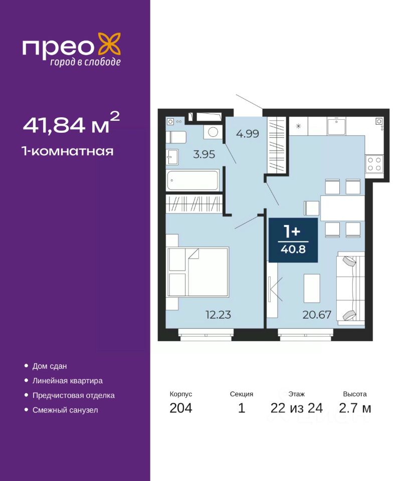 Успейте забронировать по этой цене, предложение ограничено! Стоимость квартиры указана со скидкой, ваша экономия составит 314,000 руб. Звоните, мы вам все подробно расскажем. Однокомнатная квартира с предчистовой отделкой в ЖК ''Прео'' на 22 этаже. Общая площадь: 41.84 кв.м., жилая: 12.23 кв.м., площадь просторной кухни-столовой: 20.67 кв.м. Все окна выходят на одну сторону. В квартире один совмещенный санузел. Высота потолков 2.7 м. Квартира находится в корпусе 204. Дом монолитный, одноподъездный, высотой 24 этажа. На этаже 14 квартир. В подъезде 2 грузовых лифта. В настоящее время строительство окончено, дом сдан в 4 квартале 2024 года. Оформление сделки по договору купли-продажи. Преображенский — один из самых привлекательных районов для жизни! Это полностью самостоятельный жилой район с точки зрения инфраструктуры. Преображенский находится между Московским и Червишевским трактами в квартале улиц Закалужская — Вьюжная — Александра Протозанова. Не нужно ждать, когда появится инфраструктура — переезжайте на всё готовое. Вблизи расположены действующие школа и детский сад. В этом году откроется еще один сад, а в следующем году — школа. По соседству с Преображенским запланировано строительство городского парка ''Комарово'' площадью 38 гектар. За 10 минут можно доехать на автомобиле до крупных ТРЦ: ''Лента'', ''Кристалл'', ''Леруа Мерлен'', ''Метро'' и ''Ашан''. С 2018 года в районе открыт Соседский центр — пространство, созданное для формирования добрососедской среды, совместного досуга, общения и реализации соседских инициатив. Здесь проходят встречи соседей, а также сами жители района организовывают мероприятия. Организатором такого события может стать любой желающий. В квартирах выполнена качественная предчистовая отделка. Гладкие стены с финишным выравниванием по маякам. Ровный потолок для установки натяжного потолка. Установлены пятикамерные окна с двойным стеклопакетом (3 стекла). Дизайнерские холлы с видеонаблюдением, безбарьерным и прозрачным входом всегда светло и спокойно. На первом этаже есть просторные колясочные, где все жители могут оставлять свои коляски и велосипеды. В Преображенском есть всё, что нужно для активного отдыха и занятий спортом. Мы сделали большое футбольное поле с безопасным покрытием. Также установили хоккейный корт, который оборудован по всем необходимым стандартам. Во дворах можно делать упражнения на специальных площадках с турниками. Весь район мы обустроили велодорожками, которые связаны в единый маршрут. У нас есть сухие фонтаны, бьющие из земли, деревья, веревки, сетки, скалодром, газон, песок и резинка — осталось просто дать своему ребенку право на свободную игру. По-настоящему хорошие дворы — это те, которые дети предпочитают соцсетям и телевизору. Аккредитация в банках: ПАО Банк ''ВТБ'', ПАО ''Газпромбанк'', ПАО ''Банк Уралсиб'', ОАО ''Альфа-Банк'', ''Сбербанк России'' и других. #Z5u9ce