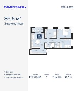 3-комн. квартира от застройщика с предчистовой отделкой в ЖК ''Мириады'' на 7 этаже. Общая площадь: 85.5 кв.м. Высота потолков 2.7 м. Квартира находится в корпусе ГП-72.101. Дом монолитный, одноподъездный, высотой 25 этажей. На этаже 8 квартир. В подъезде 2 пассажирских и 1 грузовой лифт. Строительство завершено, дом сдан в 4 квартале 2025 года. Оформление сделки по договору купли-продажи. Вселенная бесконечных историй. Ранее невиданный Тюмени масштаб: территория 240 гектаров и 1 650 000 м² застройки. Мириады это город масштабных перемен и больших возможностей. Город зеленых рощ и зеркальных озер. Город для работы, учебы и развлечений. Город для детей и их родителей. Город для всех и каждого. Проект расположен в районе Мыс рядом с ТРЦ ''Тюмень Сити Молл'' в границах улицы Тимофея Чаркова, Тобольского тракта и объездной дороги. Срок полного освоения территории - до 2034 года. #ZMezcA