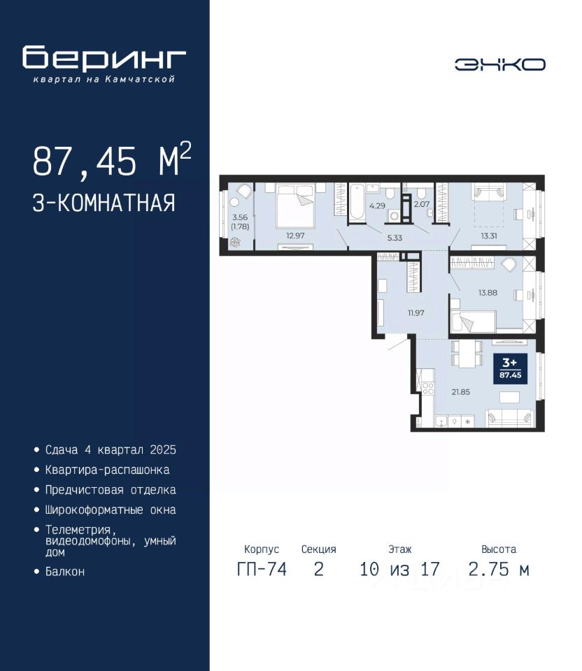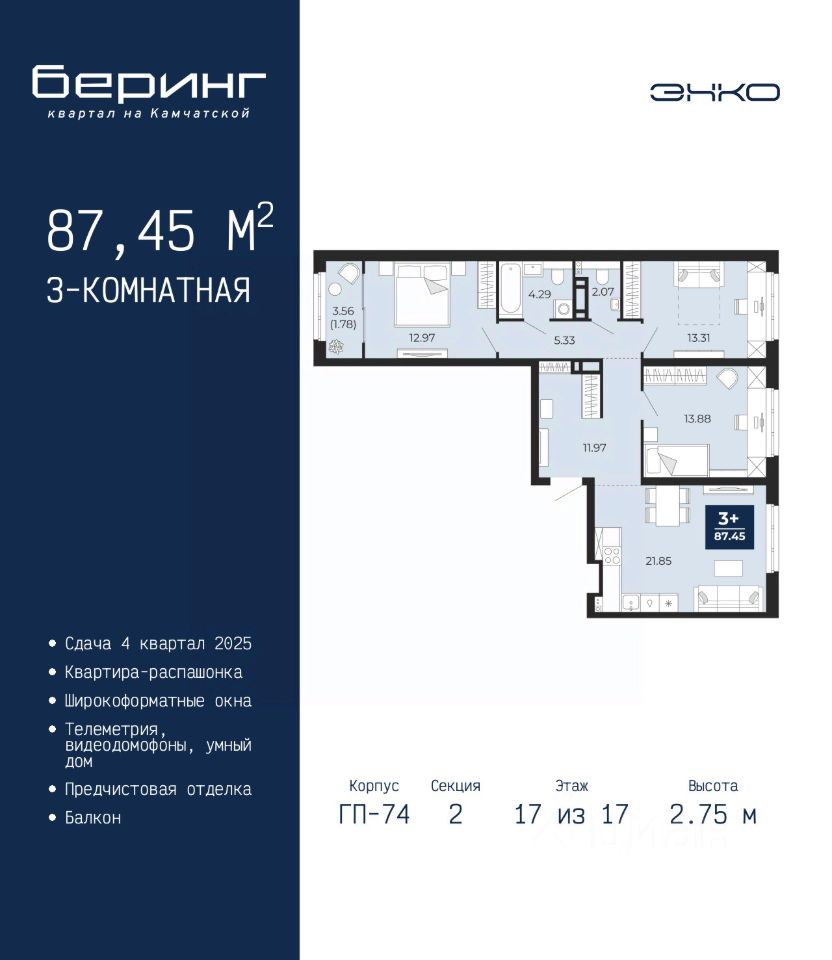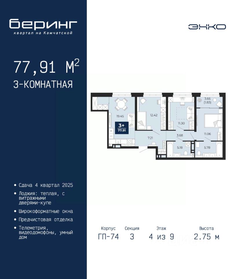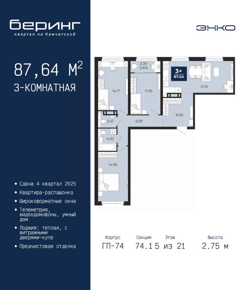 Трехкомнатная квартира с предчистовой отделкой в ЖК ''Беринг'' на 4 этаже. Общая площадь: 87.64 кв.м., жилая: 41.62 кв.м., площадь просторной кухни-столовой: 21.91 кв.м. Квартира - распашонка, без проходных комнат, окна выходят на paзные стороны дома. В квартире одна лоджия, один совмещенный и один раздельный санузел. Высота потолков 2.75 м. Дом монолитный, многоподъездный, переменной этажности, от 9 до 21 этажей. Квартира находится в 74.1-й секции высотой 21 этаж в корпусе ГП-74. На этаже 5 квартир. В подъезде 1 грузовой лифт. Окончание строительства - 4 квартал 2025 года. Оформление сделки по договору долевого участия. Подобно знаменитому исследователю, мы чувствуем себя первооткрывателями этой локации. Хотим показать новую суть места, сформировать для вас жизненный опыт, которого ещё не было. Беринг — район зелёного цвета. Беринг — район, который откроется вам с другой стороны. Впечатлит новым уровнем комфорта и качеством жизни. Беринг — открытие на карте города. Первый квартал расположен в районе Тура, в границах улиц: Камчатская Западносибирская Энтузиастов. Вокруг уже есть всё для того, чтобы ежедневная рутина была лишь частью жизни и не доставляла дискомфорта. Школы и детские сады, магазины и аптеки, поликлиника, места для семейного отдыха, пеших и велопрогулок, и даже рыбалки. Масштабное озеленение дворов — визитная карточка ЭНКО и ваш оазис спокойствия, чтобы отвлечься от повседневности. Раскидистые деревья, кустарники, травы и цветы — осталось остановиться, вдохнуть и расслабиться, глядя на эту природную красоту. Стилистика подъездов продолжает концепцию Беринга, вдохновлённого Камчаткой: сдержанный, но при этом впечатляющий дизайн соседствует с удобством и функциональностью. #Z3svZB