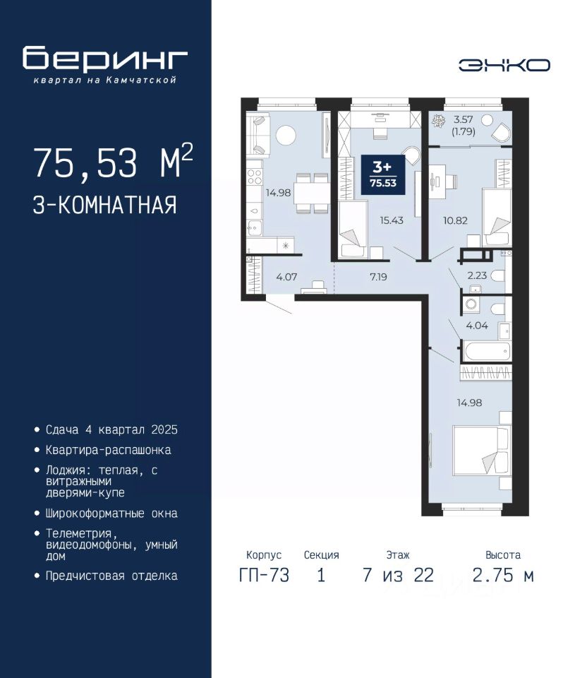 Продается трехкомнатная квартира с предчистовой отделкой в ЖК ''Беринг'' на 7 этаже. Общая площадь: 75.53 кв.м., жилая: 41.23 кв.м., площадь просторной кухни-столовой: 14.98 кв.м. Квартира - распашонка, без проходных комнат, окна выходят на paзные стороны дома. В квартире одна лоджия, один совмещенный и один раздельный санузел. Высота потолков 2.75 м. Дом монолитный, многоподъездный, переменной этажности, от 9 до 22 этажей. Квартира находится в 1-й секции высотой 22 этажа в корпусе ГП-73. На этаже 5 квартир. В подъезде 1 пассажирский и 1 грузовой лифт. Окончание строительства - 4 квартал 2025 года. Оформление сделки по договору долевого участия. Подобно знаменитому исследователю, мы чувствуем себя первооткрывателями этой локации. Хотим показать новую суть места, сформировать для вас жизненный опыт, которого ещё не было. Беринг — район зелёного цвета. Беринг — район, который откроется вам с другой стороны. Впечатлит новым уровнем комфорта и качеством жизни. Беринг — открытие на карте города. Первый квартал расположен в районе Тура, в границах улиц: Камчатская Западносибирская Энтузиастов. Вокруг уже есть всё для того, чтобы ежедневная рутина была лишь частью жизни и не доставляла дискомфорта. Школы и детские сады, магазины и аптеки, поликлиника, места для семейного отдыха, пеших и велопрогулок, и даже рыбалки. Масштабное озеленение дворов — визитная карточка ЭНКО и ваш оазис спокойствия, чтобы отвлечься от повседневности. Раскидистые деревья, кустарники, травы и цветы — осталось остановиться, вдохнуть и расслабиться, глядя на эту природную красоту. Стилистика подъездов продолжает концепцию Беринга, вдохновлённого Камчаткой: сдержанный, но при этом впечатляющий дизайн соседствует с удобством и функциональностью. #zsUtVl