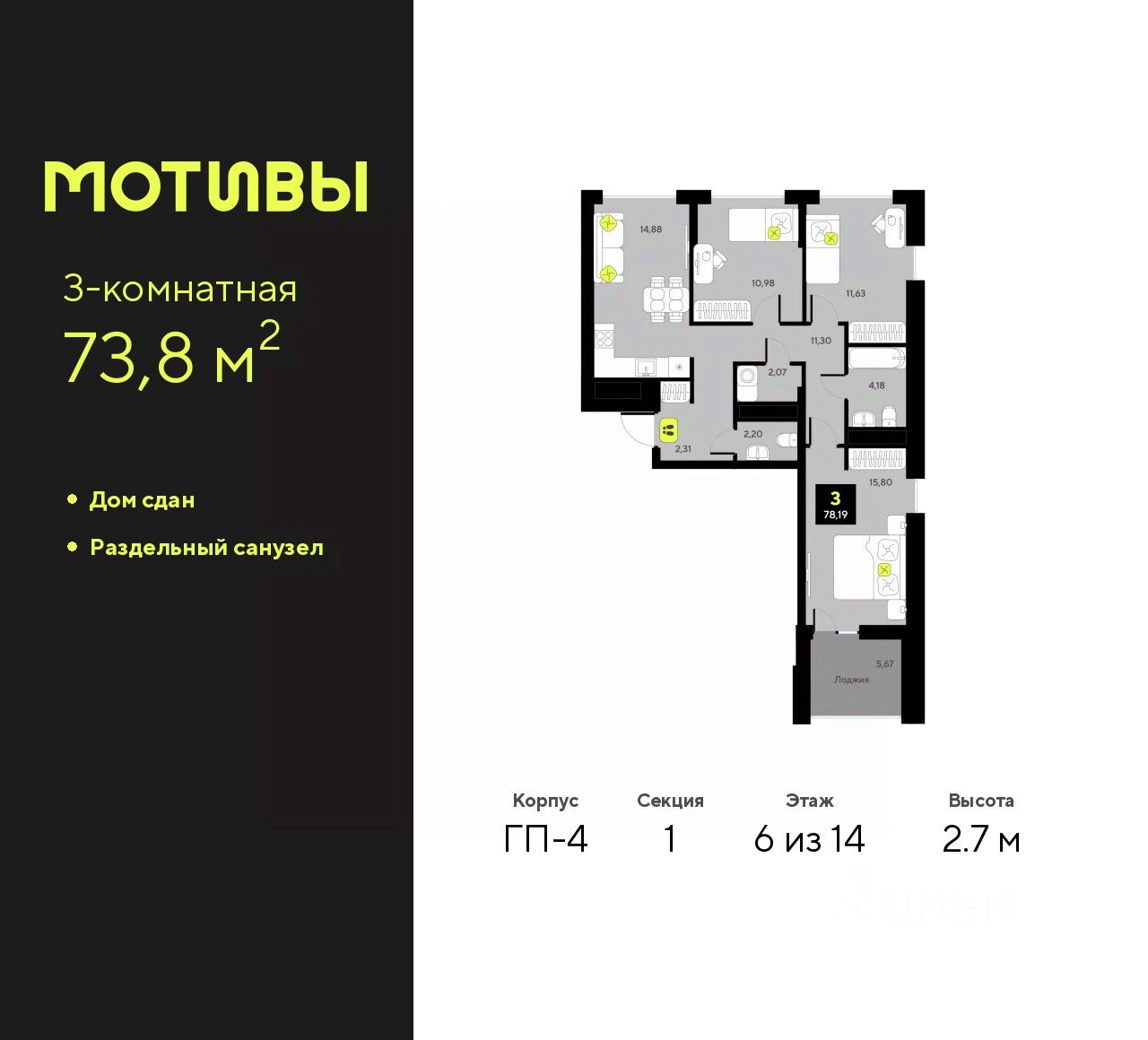 73 м² · Этаж 6 из 14