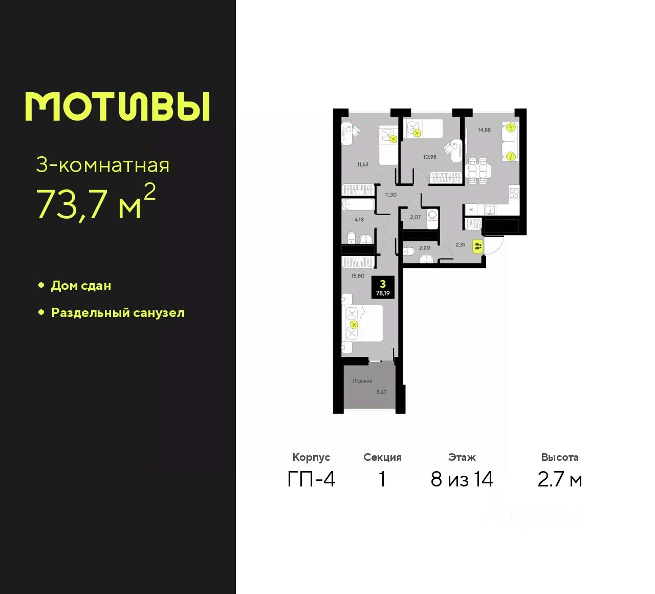73 м² · Этаж 8 из 14