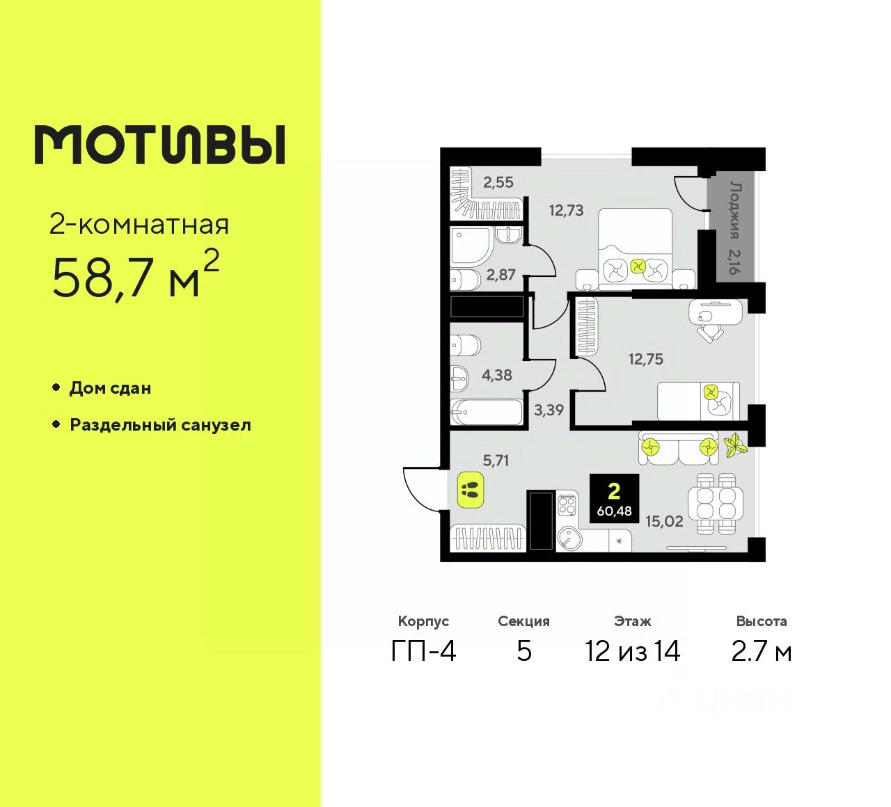 Продается 2-комн. квартира от застройщика с предчистовой отделкой в ЖК ''Мотивы'' на 12 этаже. Общая площадь: 58.7 кв.м., жилая: 25.48 кв.м., площадь просторной кухни-столовой: 15.02 кв.м. Угловая квартира, идеально подойдет любителям тишины и панорамных видов. В квартире одна лоджия, два совмещенных санузла. Высота потолков 2.7 м. Квартира будет сдаваться с предчистовой отделкой White Box: выровнены и оштукатурены стены, проведено электричество и отопление, установлены радиаторы. Вы также можете приобрести квартиру с ремонтом от застройщика, представленным в трех цветовых решениях Scandi, Wood и Coffee и включающим ламинат, обои под покраску, двери, натяжной потолок и санузел с сантехникой. При желании вы можете заказать отделку под ключ, варианты возможных решений представлены в альбоме фотографий. Дом монолитный, многоподъездный, переменной этажности, от 5 до 14 этажей. Квартира находится в 5-й секции высотой 14 этажей в корпусе ГП-4. На этаже 5 квартир. В подъезде 1 пассажирский и 1 грузовой лифт. На сегодняшний день строительство завершено, дом сдан в 4 квартале 2024 года. Оформление сделки по договору купли-продажи. Закрытая от автомобилей территория, безопасный двор и камеры видеонаблюдения - гаранты вашего спокойствия. Квартал будет располагать богатой инфраструктурой: на первых этажах разместятся магазины, пекарни, кофейни, пункты выдачи, аптеки, детские центры, цветочные салоны и многое другое, что сделает жизнь поистине комфортной. Рядом находится парк общей площадью почти 5000 м², в котором располагаются локации для игр и отдыха жителей, здесь можно совершить утреннюю пробежку или прогуляться после рабочего дня. В парке есть зона воркаута с тренажерами для взрослых, игровые комплексы с горками и канатный комплекс для детей разных возрастов, качели и лавочки для отдыха, площадки для командных видов спорта и для панна-футбола. В ЖК ''Мотивы'' всё продумано до мелочей: светлые холлы входных групп, оформленные в едином стиле, просторные колясочные, лапомойки для питомцев. На территории комплекса находятся 2 8-ми этажных паркинга и более 1000 м/м на открытой парковке. Жилой комплекс находится в одном из экологически благоприятных районов Тюмени, недалеко от Плехановского бора. При этом до центра города можно добраться за 15 минут, а до международного аэропорта Рощино за 13 минут. Окончание строительства: ГП 1, 2, 3, 4 сдача до конца 2024 года, ГП 6, 7, 8 сдача 2 квартал 2026 года. #zmdsZZ
