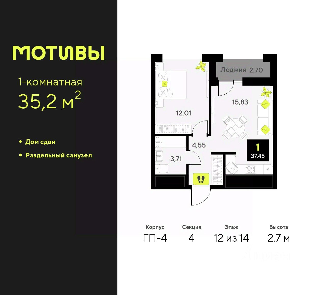35 м² · Этаж 12 из 14