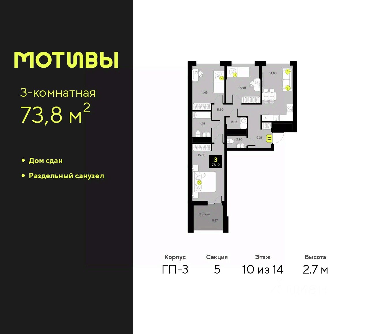 Трехкомнатная квартира с предчистовой отделкой в ЖК ''Мотивы'' на 10 этаже. Общая площадь: 73.8 кв.м. Высота потолков 2.7 м. Квартира будет сдаваться с предчистовой отделкой White Box: выровнены и оштукатурены стены, проведено электричество и отопление, установлены радиаторы. Вы также можете приобрести квартиру с ремонтом от застройщика, представленным в трех цветовых решениях Scandi, Wood и Coffee и включающим ламинат, обои под покраску, двери, натяжной потолок и санузел с сантехникой. При желании вы можете заказать отделку под ключ, варианты возможных решений представлены в альбоме фотографий. Дом монолитный, черырехподъездный, переменной этажности, от 12 до 14 этажей. Квартира находится в 5-й секции высотой 14 этажей в корпусе ГП-3. На этаже 5 квартир. В подъезде 1 пассажирский и 1 грузовой лифт. Строительство окончено, дом сдан в 4 квартале 2024 года. Оформление сделки по договору купли-продажи. Закрытая от автомобилей территория, безопасный двор и камеры видеонаблюдения - гаранты вашего спокойствия. Квартал будет располагать богатой инфраструктурой: на первых этажах разместятся магазины, пекарни, кофейни, пункты выдачи, аптеки, детские центры, цветочные салоны и многое другое, что сделает жизнь поистине комфортной. Рядом находится парк общей площадью почти 5000 м², в котором располагаются локации для игр и отдыха жителей, здесь можно совершить утреннюю пробежку или прогуляться после рабочего дня. В парке есть зона воркаута с тренажерами для взрослых, игровые комплексы с горками и канатный комплекс для детей разных возрастов, качели и лавочки для отдыха, площадки для командных видов спорта и для панна-футбола. В ЖК ''Мотивы'' всё продумано до мелочей: светлые холлы входных групп, оформленные в едином стиле, просторные колясочные, лапомойки для питомцев. На территории комплекса находятся 2 8-ми этажных паркинга и более 1000 м/м на открытой парковке. Жилой комплекс находится в одном из экологически благоприятных районов Тюмени, недалеко от Плехановского бора. При этом до центра города можно добраться за 15 минут, а до международного аэропорта Рощино за 13 минут. Окончание строительства: ГП 1, 2, 3, 4 сдача до конца 2024 года, ГП 6, 7, 8 сдача 2 квартал 2026 года. #2mdWcW