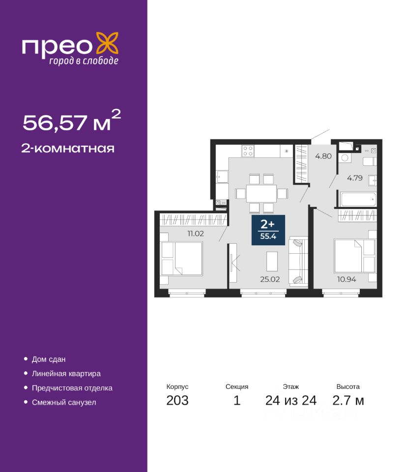 Торопитесь оформить бронирование по этой цене, период предложения ограничен! Стоимость квартиры указана со скидкой, ваша экономия составит 409,000 руб. Звоните, мы вам все подробно расскажем. Продается 2-комн. квартира от застройщика с предчистовой отделкой в ЖК ''Прео'' на 24 этаже. Общая площадь: 56.57 кв.м., жилая: 21.96 кв.м., площадь просторной кухни-столовой: 25.02 кв.м. Комнаты изолированные, все окна выходят на одну сторону. В квартире один совмещенный санузел. Высота потолков 2.7 м. Квартира находится в корпусе 203. Дом монолитный, одноподъездный, высотой 24 этажа. На этаже 14 квартир. В подъезде 2 грузовых лифта. В настоящее время строительство завершено, дом сдан в 4 квартале 2024 года. Оформление сделки по договору купли-продажи. Преображенский — один из самых привлекательных районов для жизни! Это полностью самостоятельный жилой район с точки зрения инфраструктуры. Преображенский находится между Московским и Червишевским трактами в квартале улиц Закалужская — Вьюжная — Александра Протозанова. Не нужно ждать, когда появится инфраструктура — переезжайте на всё готовое. Вблизи расположены действующие школа и детский сад. В этом году откроется еще один сад, а в следующем году — школа. По соседству с Преображенским запланировано строительство городского парка ''Комарово'' площадью 38 гектар. За 10 минут можно доехать на автомобиле до крупных ТРЦ: ''Лента'', ''Кристалл'', ''Леруа Мерлен'', ''Метро'' и ''Ашан''. С 2018 года в районе открыт Соседский центр — пространство, созданное для формирования добрососедской среды, совместного досуга, общения и реализации соседских инициатив. Здесь проходят встречи соседей, а также сами жители района организовывают мероприятия. Организатором такого события может стать любой желающий. В квартирах выполнена качественная предчистовая отделка. Гладкие стены с финишным выравниванием по маякам. Ровный потолок для установки натяжного потолка. Установлены пятикамерные окна с двойным стеклопакетом (3 стекла). Дизайнерские холлы с видеонаблюдением, безбарьерным и прозрачным входом всегда светло и спокойно. На первом этаже есть просторные колясочные, где все жители могут оставлять свои коляски и велосипеды. В Преображенском есть всё, что нужно для активного отдыха и занятий спортом. Мы сделали большое футбольное поле с безопасным покрытием. Также установили хоккейный корт, который оборудован по всем необходимым стандартам. Во дворах можно делать упражнения на специальных площадках с турниками. Весь район мы обустроили велодорожками, которые связаны в единый маршрут. У нас есть сухие фонтаны, бьющие из земли, деревья, веревки, сетки, скалодром, газон, песок и резинка — осталось просто дать своему ребенку право на свободную игру. По-настоящему хорошие дворы — это те, которые дети предпочитают соцсетям и телевизору. Аккредитация в банках: ПАО ''Газпромбанк'', ОАО ''Альфа-Банк'', ''Сбербанк России'', ПАО Банк ''ВТБ'', ПАО ''Банк Уралсиб'' и других. #22cwc6