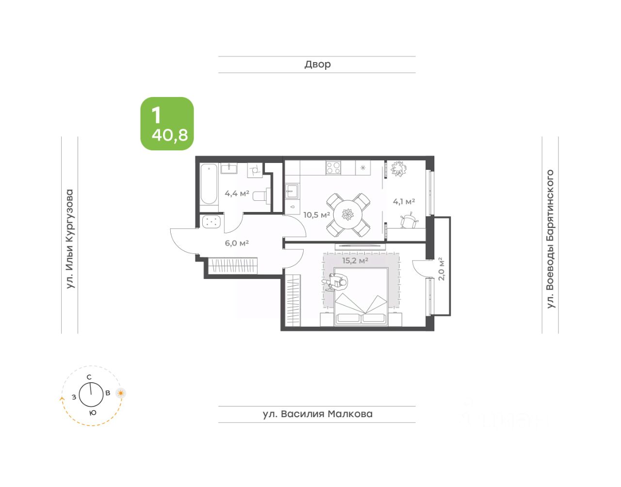 Квартира с видом на двор и природный сквер •Удобная кухня с выделенной зоной, которую вы можете использовать как кабинет или зону отдыха •Просторная спальня с выходом на французский балкон •Вместительный коридор с нишей под шкаф-купе •Санузел, где вместится все необходимое