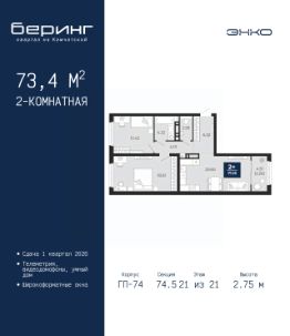 Успейте оформить бронирование по акционной цене, предложение ограничено! Стоимость квартиры указана со скидкой, ваша экономия составит 456,450 руб. По всем вопросам звоните в офис продаж, мы вам все подробно расскажем. Просторная 2-комн. квартира в ЖК ''Беринг'' на 21 этаже. Общая площадь: 73.4 кв.м. Высота потолков 2.75 м. Дом монолитный, многоподъездный, переменной этажности, от 9 до 21 этажей. Квартира находится в 74.5-й секции высотой 21 этаж в корпусе ГП-74. На этаже 7 квартир. В подъезде 1 пассажирский и 1 грузовой лифт. Окончание строительства - 1 квартал 2026 года. Оформление сделки по договору долевого участия. Подобно знаменитому исследователю, мы чувствуем себя первооткрывателями этой локации. Хотим показать новую суть места, сформировать для вас жизненный опыт, которого ещё не было. Беринг — район зелёного цвета. Беринг — район, который откроется вам с другой стороны. Впечатлит новым уровнем комфорта и качеством жизни. Беринг — открытие на карте города. Первый квартал расположен в районе Тура, в границах улиц: Камчатская Западносибирская Энтузиастов. Вокруг уже есть всё для того, чтобы ежедневная рутина была лишь частью жизни и не доставляла дискомфорта.Школы и детские сады, магазины и аптеки, поликлиника, места для семейного отдыха, пеших и велопрогулок, и даже рыбалки. Масштабное озеленение дворов — визитная карточка ЭНКО и ваш оазис спокойствия, чтобы отвлечься от повседневности. Раскидистые деревья, кустарники, травы и цветы — осталось остановиться, вдохнуть и расслабиться, глядя на эту природную красоту. Стилистика подъездов продолжает концепцию Беринга, вдохновлённого Камчаткой: сдержанный,но при этом впечатляющий дизайн соседствует с удобством и функциональностью. #z6EOfv