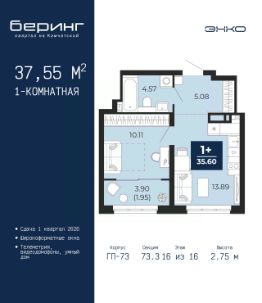Успейте забронировать, пока действует скидка, период акции ограничен! Стоимость квартиры указана со скидкой, ваша экономия составит 315,706 руб. Информация по телефону, мы вам все подробно расскажем. 1-комн. квартира от застройщика в ЖК ''Беринг'' на 16 этаже. Общая площадь: 37.55 кв.м. Высота потолков 2.75 м. Дом монолитный, многоподъездный, переменной этажности, от 9 до 22 этажей. Квартира находится в 73.3-й секции высотой 16 этажей в корпусе ГП-73. На этаже 8 квартир. В подъезде 1 пассажирский и 1 грузовой лифт. Окончание строительства - 1 квартал 2026 года. Оформление сделки по договору долевого участия. Подобно знаменитому исследователю, мы чувствуем себя первооткрывателями этой локации. Хотим показать новую суть места, сформировать для вас жизненный опыт, которого ещё не было. Беринг — район зелёного цвета. Беринг — район, который откроется вам с другой стороны. Впечатлит новым уровнем комфорта и качеством жизни. Беринг — открытие на карте города. Первый квартал расположен в районе Тура, в границах улиц: Камчатская Западносибирская Энтузиастов. Вокруг уже есть всё для того, чтобы ежедневная рутина была лишь частью жизни и не доставляла дискомфорта.Школы и детские сады, магазины и аптеки, поликлиника, места для семейного отдыха, пеших и велопрогулок, и даже рыбалки. Масштабное озеленение дворов — визитная карточка ЭНКО и ваш оазис спокойствия, чтобы отвлечься от повседневности. Раскидистые деревья, кустарники, травы и цветы — осталось остановиться, вдохнуть и расслабиться, глядя на эту природную красоту. Стилистика подъездов продолжает концепцию Беринга, вдохновлённого Камчаткой: сдержанный,но при этом впечатляющий дизайн соседствует с удобством и функциональностью. #z6De3I