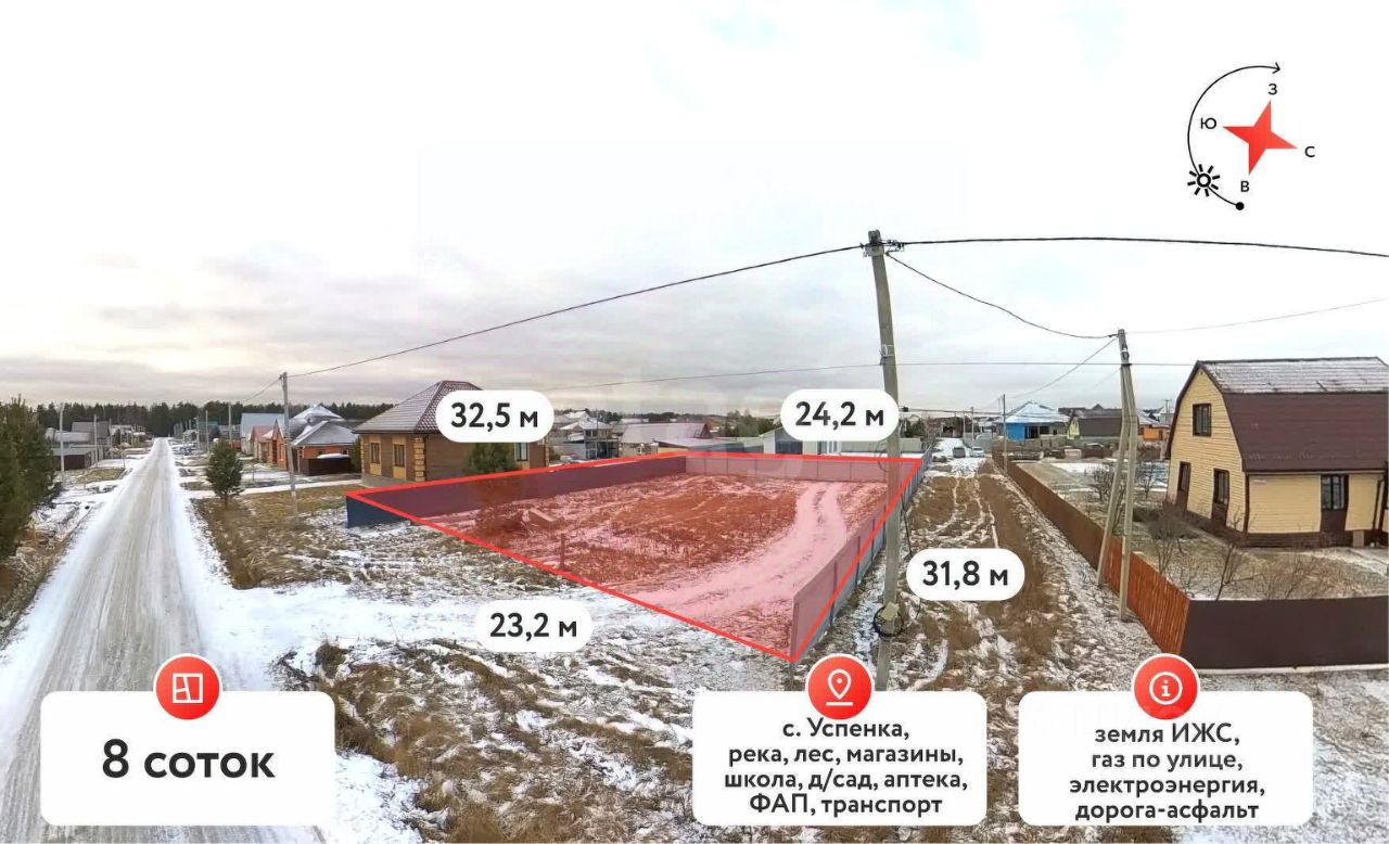 Арт. 69286392 Продам: земельный участок 8соток в с. Успенка, Тюменской области 25 км от города Тюмени!!! Проходит по СЕЛСКОЙ ипотеке!!! Участок ровный, правильной формы. Назначение земли - ИЖС!!! Участок высокий, прямоугольной формы, имеется ГАЗ, вода - скважина, электричество, канализация - септик кольца 8куб! На участке строящийся дом площадью110кв.м. Построен на ленточном фундаменте, стены керамический кирпич + газоблок, По всей улице асфальтная срезка. По документам юридически чист, В поселке есть все необходимое для проживания - школа, детский сад, магазины, аптека, (автобус регулярно ходит в город)!
