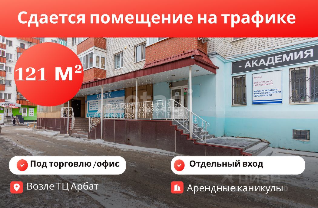 Сдается отличное помещение 121, 44 м2 в очень проходимом месте! БЕЗ КОМИССИИ ДЛЯ АРЕНДАТОРА Основные характеристики и преимущества помещения: - 1 этаж, - отдельная входная группа, - доступ 24\7, - место под вывеску, - потолки 3, 2 м, - косметический ремонт, - большой торговый зал, подсобное помещение, санузел, - помещение расположено сразу за ТЦ Арбат, возле дороги, высокий трафик. Стоимость 95 000 руб. /месяц + КУ (свет, тепло), Депозит за последний месяц. Предоставляются арендные каникулы на время ремонта! Звоните, приходите на просмотры! _________________________________________________ _______ Федеральная компания ''Этажи'', Самая большая база коммерческой недвижимости! ОБРАТИТЕ ВНИМАНИЕ! АРЕНДА КОММЕРЧЕСКОЙ НЕДВИЖИМОСТИ ЧЕРЕЗ КОМПАНИЮ ''ЭТАЖИ'' БЕЗ КОМИССИИ ДЛЯ АРЕНДАТОРА! Код пользователя: 159076 Номер в базе: 4256582