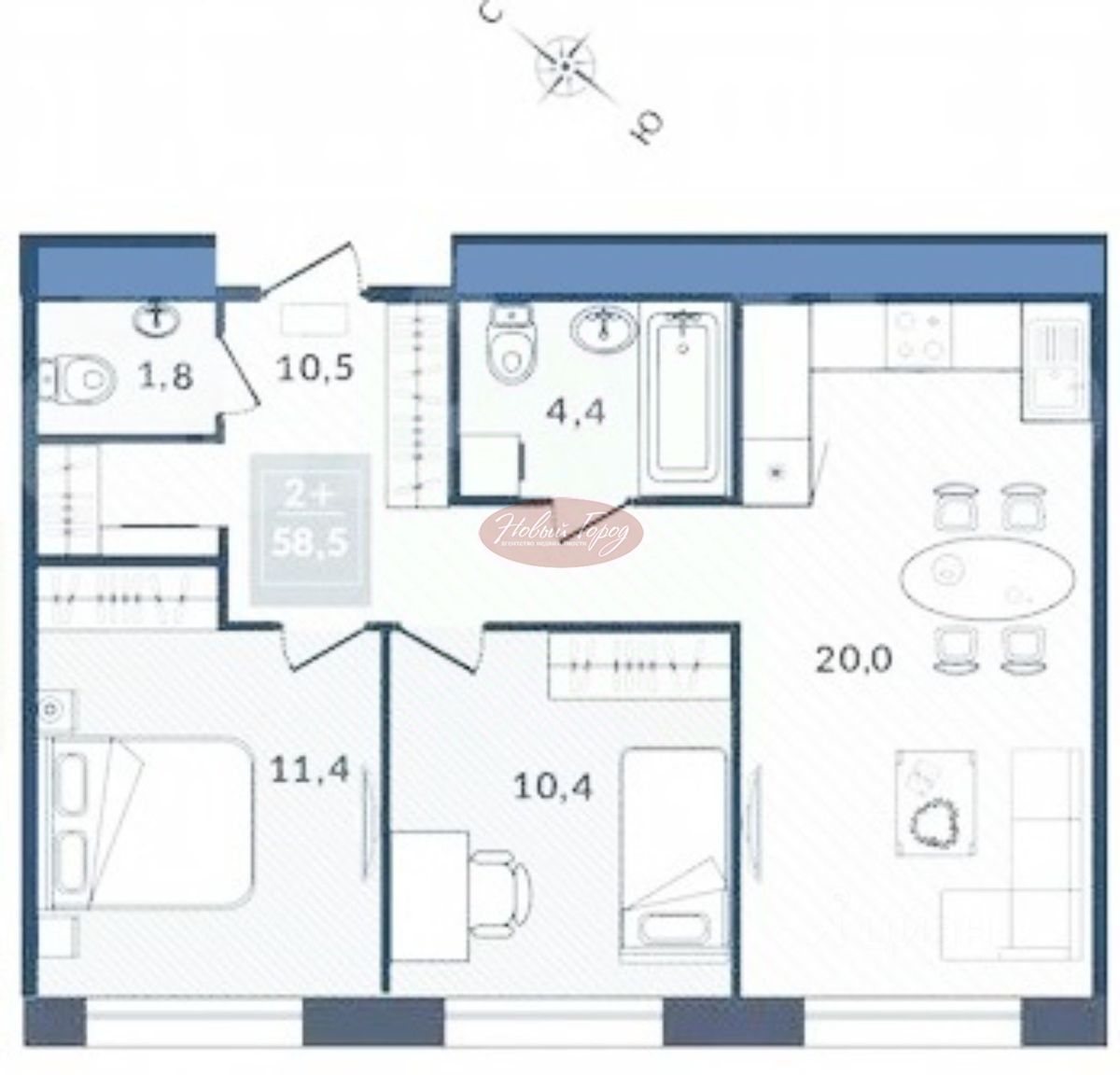 Кухня- гостиная 20 кв. м., спальни 10,4кв.м и 11,4 кв.м, санузел раздельный, гардеробная.