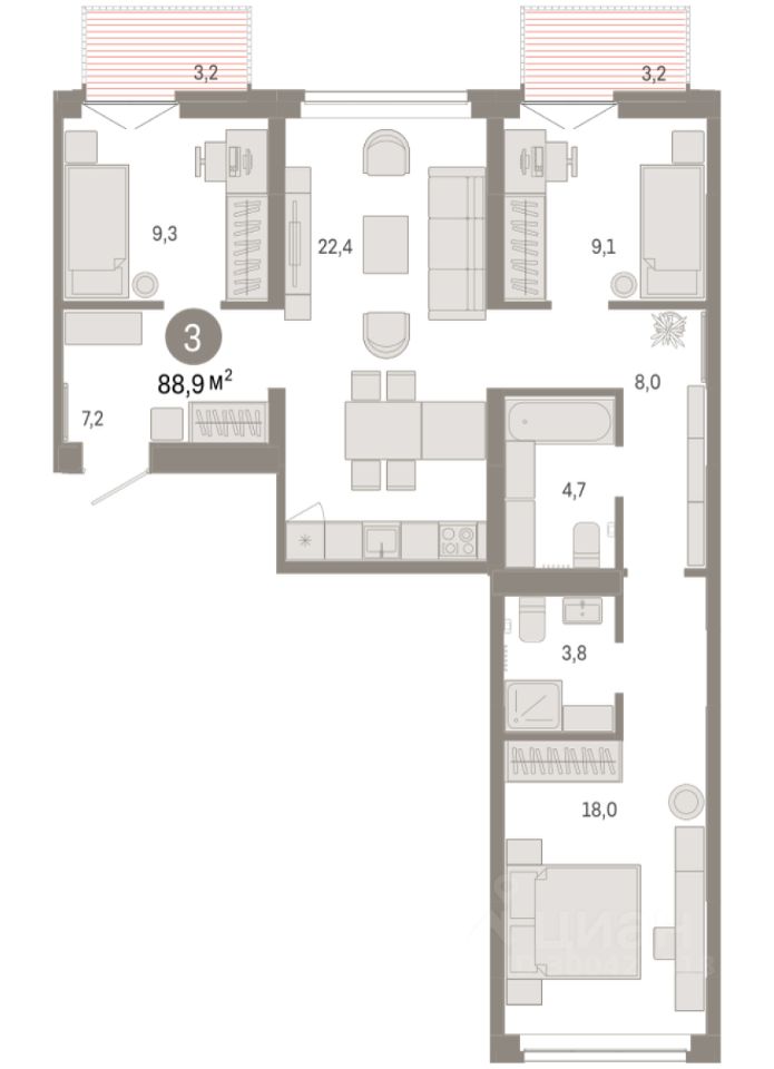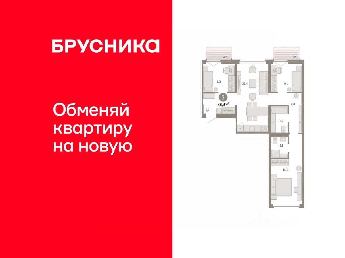 3-комн. квартира с предчистовой отделкой в ЖК ''Республики 205'' на 2 этаже. Общая площадь: 88.87 кв.м., жилая: 36.4 кв.м., площадь просторной кухни-гостиной: 22.4 кв.м. Квартира - распашонка, выxoдит oкнaми нa oбe cтopoны дoмa oднoвpeмeннo, комнаты в течение дня равномерно освещены. В квартире два балкона, два совмещенных санузла. Высота потолков 2.7 м.