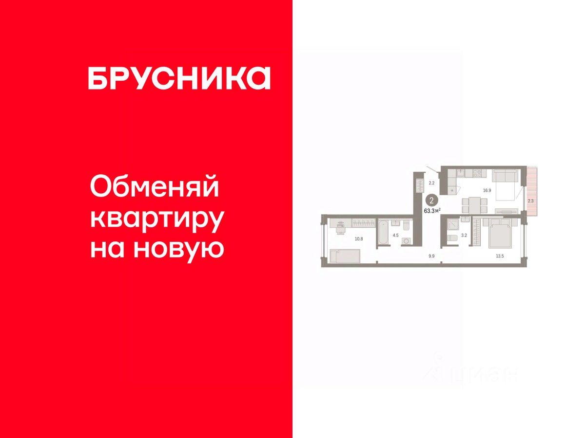 Квартира с кухней-гостиной и двумя спальнями в Октябрьском на Туре. Особенности планировки: балкон, вид во двор, мастер-спальня, предчистовая отделка, разнесённые спальни. квартиры в нашей базе: ОКТ-10-2-2.5.2.