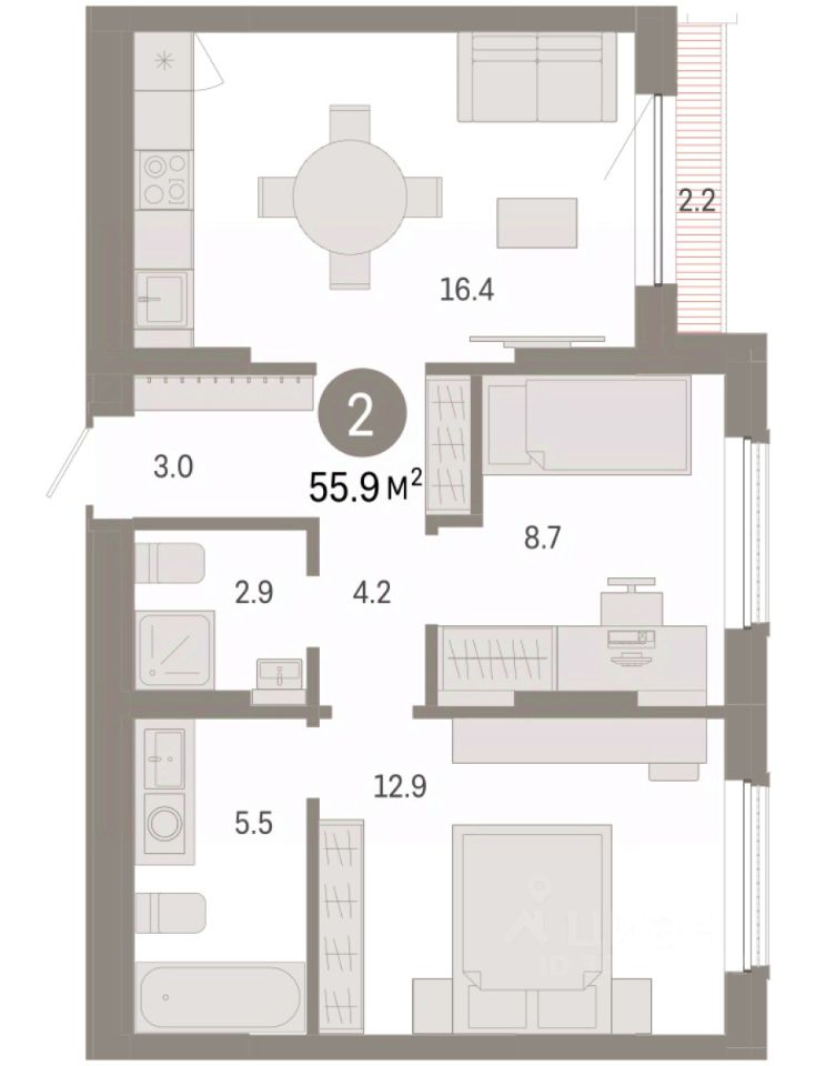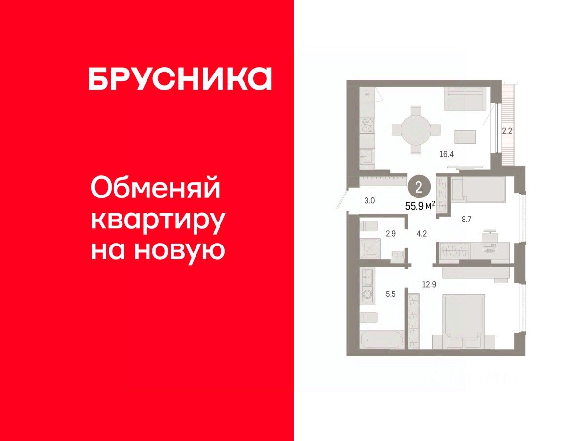 Квартира с кухней-гостиной и двумя спальнями в Октябрьском на Туре. Особенности планировки: предчистовая отделка, терраса на крыше. квартиры в нашей базе: ОКТ-10-5-5.7.2.