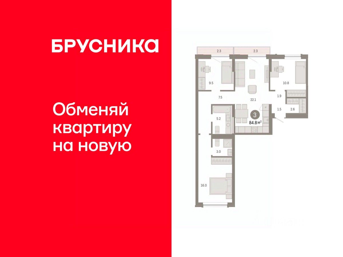 Квартира с кухней-гостиной и тремя спальнями в Октябрьском на Туре. Особенности планировки: балкон, вид во двор, гардеробная, мастер-спальня, предчистовая отделка, разнесённые спальни. квартиры в нашей базе: ОКТ-10-6-6.4.5.
